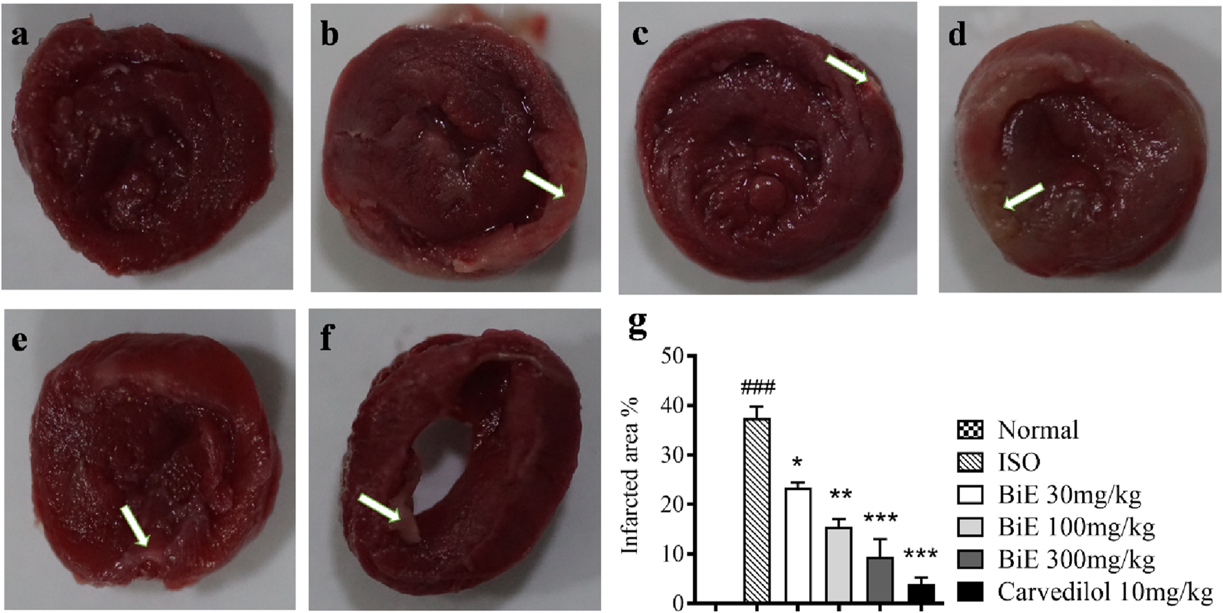 Effect of BiE and carvedilol (10 mg/kg) along with the normal and ISO groups on heart tissue observed with TTC staining in ISO-induced MI (n = 3). (a) Normal, (b) ISO, (c) carvedilol, (d) BiE 30, (e) BiE 100, (f) BiE 300 mg/kg, and (g) infarct quantification. Brick-red-stained areas show viable myocardium, whereas white or unstained areas (indicated by the white arrow) represent infarcted areas. The ISO group was compared with the control group, and significance is indicated as follows: ### = p < 0.001. In contrast, BiE and carvedilol were compared with the ISO group, and significance is denoted as follows: * = p < 0.05, ** = p < 0.01, and *** = p < 0.001.