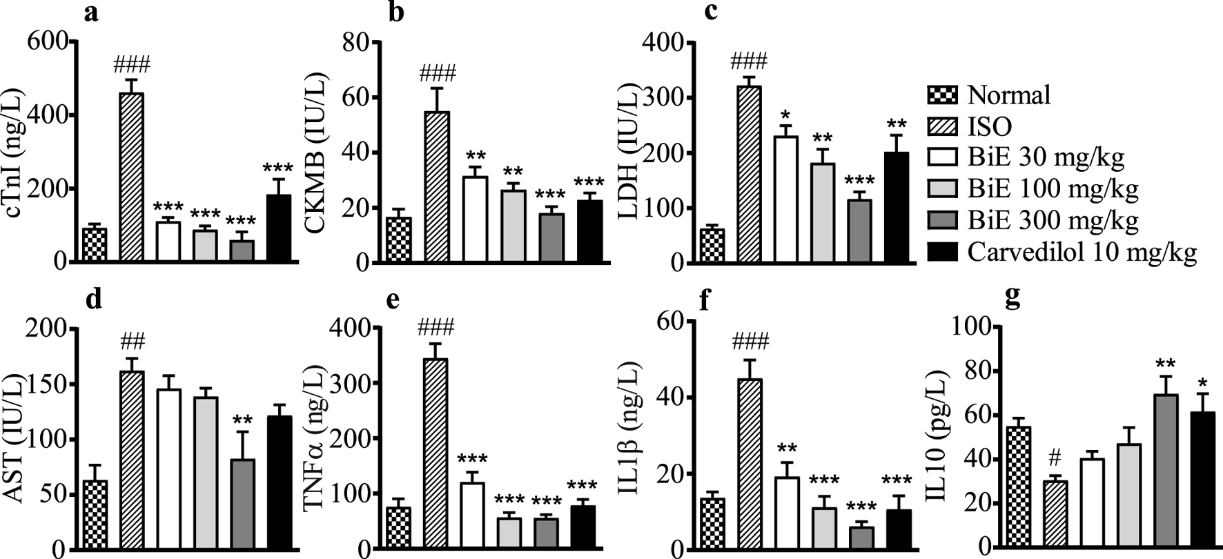 Effect of BiE and carvedilol on serum levels of (a) cTnI, (b) CKMB, (c) LDH, (d) AST, (e) TNF-α, (f) IL-1β, and (g) IL-10 in ISO-induced MI. Data is presented as the mean ± SEM (n = 3). One-way ANOVA followed by Tukey’s test was used to analyze the results. The ISO group was compared with the control group, and significance is indicated as follows: # = p < 0.05, ## = p < 0.01, and ### = p < 0.001. In contrast, BiE and carvedilol were compared with the ISO group, and significance is denoted as follows: * = p < 0.05, ** = p < 0.01, and *** = p < 0.001.