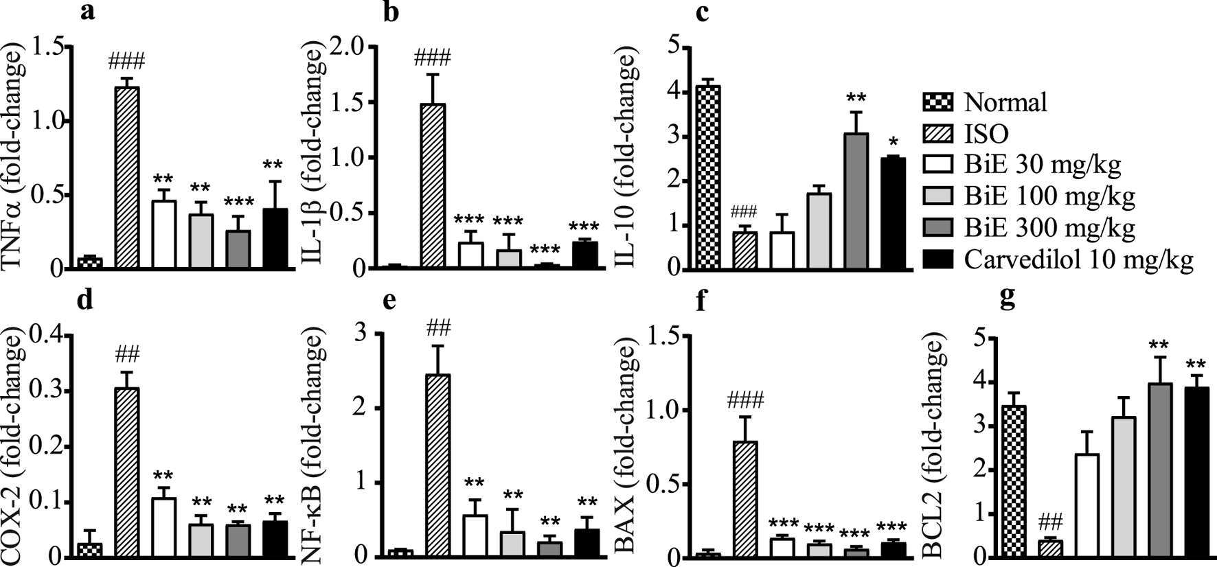 Effects of BiE and carvedilol on mRNA levels of (a) TNF-α, (b) IL-1β, (c) IL-10, (d) COX-2, (e) NF-κB, (f) BAX, and (g) BCL-2 in isoproterenol-induced MI. Data is presented as the mean ± SEM (n = 3). One-way ANOVA followed by Tukey’s test was used to analyze the results. The ISO group was compared with the control group, and significance is indicated as ## = p < 0.01 and ### = p < 0.001. In contrast, BiE and carvedilol were compared with the ISO group, and significance is denoted as follows: * = p < 0.05, ** = p < 0.01, and *** = p < 0.001.