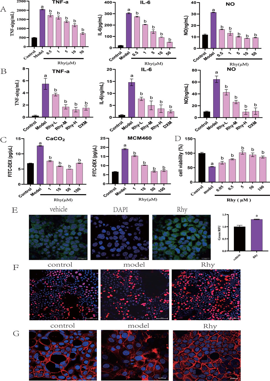 Figure 1. Rhy is a potent anti-inflammatory chemical compound and induces tight junction proteins. (A) RAW264.7 were stimulated with LPS without or with Rhy. IL-6, TNF-α and NO levels in supernatants were measured (n = 4). (B) C57BL/6j mice were pretreated with Rhy, serum levels of IL-6, TNF-α and NO was measured (n = 4). (C) FITC dextran was added to Caco2 or NCM460 cells to measure effect of Rhy on permeability of cells (n = 3). (D) CCK-8 method was used to detect the effect of Rhy on the proliferation of NCM460 cells (n = 5). (E) The level of Cldn4 protein was measured by immunofluorescence (n = 3). Scale bars for Caco2 cells indicate 50 μm respectively. (F) The effect of Rhy on the proliferation of Caco2 cells was detected by EDU method (n = 3). The cells were stained with 5-acetylene-2′-deoxyuridine. (G) Effect of Rhy on the cytoskeleton of Caco2 cells (n = 3). The cells were stained with rhodamine-phalloidin. a P < 0.05, indicating comparison with control group; b P < 0.05, indicating comparison with model group. Data were expressed as mean ± SEM.