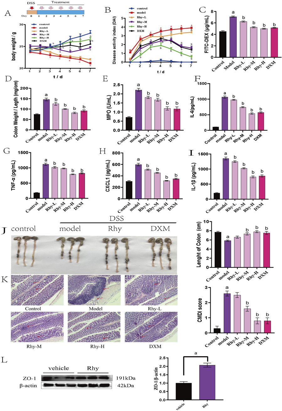 Figure 2. Rhy treatment attenuates DSS-induced colitis in mice (n = 10). (A) Body weight loss. (B) Disease activity index. (C) Intestinal permeability. (D) Ratio of colon weight/length. (E) Effect of Rhy on the levels of inflammatory factors MPO in the colon homogenate of IBD mice. (F) IL-6 level. (G) TNF-α level. (H) CXCL-1 level. (I) IL-1β level. (J) Colon lengths. (K) Microphotographs of hematoxylin and eosin (H&E) stained sections of colons and inflammation scores are shown. Scale bar indicates 100 μm. (L) ZO-1 expression in the colons of these mice was measured by immunoblots and quantified (n = 3). a P < 0.05, indicating comparison with control group, b P < 0.05, indicating comparison with model group. Data were expressed as mean ± SEM.
