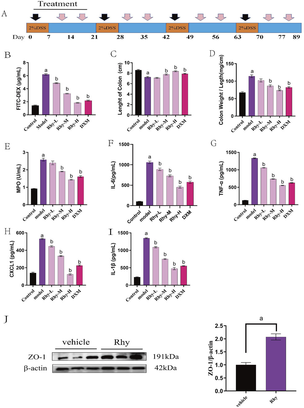 Figure 3. Rhy prevent DSS-induced chronic colitis. (A) Methods of chronic colitis modeling and drug administration (n = 10). (B) Intestinal permeability was evaluated using FITC-dextran leakage assay. (C) Colon lengths. (D) Ratio of colon weight/length. (E) Effect of Rhy on the levels of inflammatory factors MPO in the colon homogenate of IBD mice. (F) IL-6 level. (G) TNF-α level. (H) CXCL-1 level. (I) IL-1β level. (J) ZO-1 expression in the colons of these mice was measured by immunoblots and quantified (n = 3). a P < 0.05, indicating comparison with control group, b P < 0.05, indicating comparison with model group. Data were expressed as mean ± SEM.