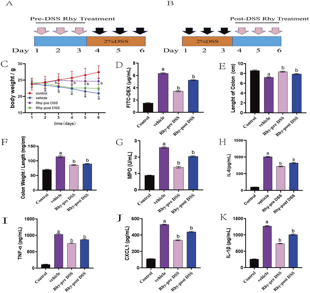 Figure 4. Rhy prevent DSS-induced colitis and sustain beneficial barrier activities (n = 10). (A) Pre-DSS treatment. (B) Post-DSS treatment. (C) Percent body weight loss was recorded after DSS-administration. (D) Intestinal permeability was evaluated using FITC-dextran leakage assay. (E) Colon lengths. (F) Ratio of colon weight/length. (G) Effect of Rhy on the levels of inflammatory factors MPO in the colon homogenate of IBD mice. (H) IL-6 level. (I) TNF-α level. (J) CXCL-1 level. (K) IL-1β level. a P < 0.05, indicating comparison with control group, b P < 0.05, indicating comparison with model group. Data were expressed as mean ± SEM.