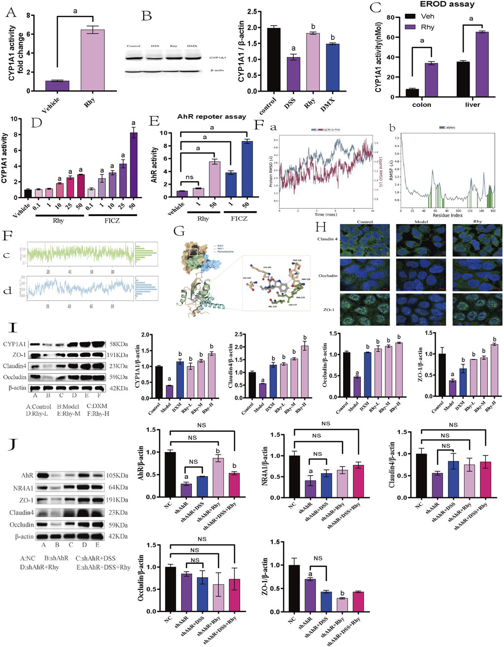 Figure 5. Rhy enhance tight junction proteins in AhR-dependent manner. (A) mRNA levels of Cytochrome P450 1A1 (Cyp1A1) was measured by RT-PCR (n = 7). (B) Cyp1A1 protein levels were measured using immunoblots and quantified (n = 3). (C) Cyp1A1 activity was measured in colons and livers by ethoxyresorufin-O-deethylase (EROD) assay (n = 6). (D) Cyp1A1 enzyme activity was measured by P450-Glo Cyp1A1 assay (n = 3). (E) The cells expressing AhR-reporter (luciferase) were treated with Rhy or FICZ (AhR high affinity ligand) and fold change of luminescence over vehicle treatment was measured (n = 3). (F) Molecular dynamics simulation of Rhy and AhR. (A). RMSD system of Rhy-AhR; (B). RMSF system of Rhy-AhR; (C). Rhy-AhR system radius of rotation; (D). Rhy-AhR system solvent can reach surface area. (G) Interaction between Rhy and AHR. (H) Effect of Rhy on intestinal barrier related proteins Claudin4, Occludin and ZO-1 (n = 3). (I) Effects of Rhy on Cyp1A1 and intestinal barrier related proteins (n = 3). (J) Expression of AhR, NR4A1protein and intestinal barrier protein after knocking down AhR (n = 3). a P < 0.05, indicating comparison with control group, b P < 0.05, indicating comparison with model group. Data were expressed as mean ± SEM.