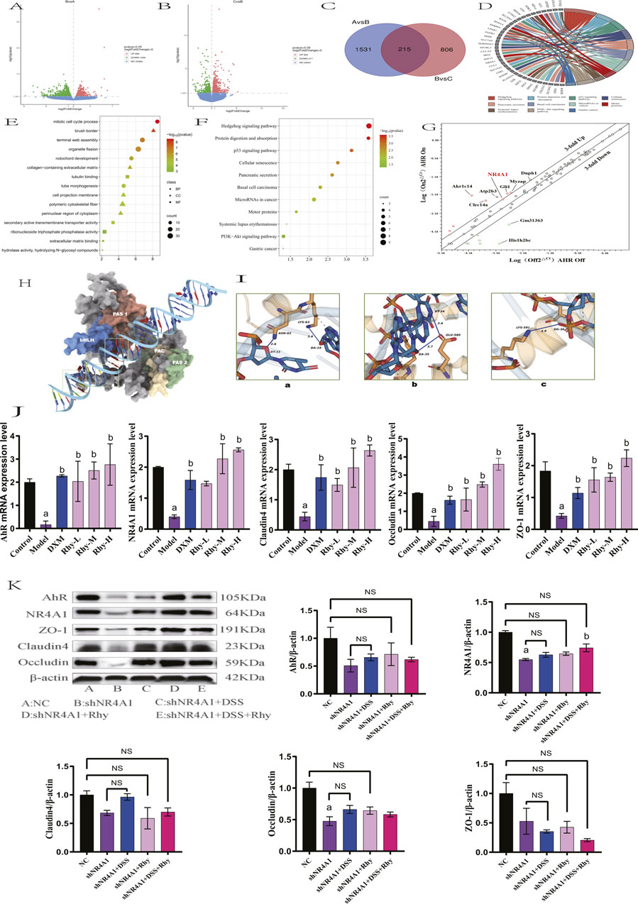 Figure 6. NR4A1 is required for Rhy mediated upregulation of tight junction proteins. (A) Differential gene expression between control group and model group (n = 3). (B) Differential gene expression between model group and Rhy group (n = 3). A is control group, B is model group, C is Rhy group. (C) The intersection of different genes in control group, model group and Rhy group. (D) Differential genes are expressed in the pathway. (E) GO Analysis of differential genes in colon tissue of IBD mice. (F) KEGG Analysis of differential genes in colon tissue of IBD mice. (G) A focused RT-QPCR screen of gene expression in the AhR-inducible (n = 3). (H) Three-dimensional structure of AhR and NR4A1. (I) AhR interacts with the NR4A1 complex. (J) Effect of Rhynchophylline on NR4A1 and intestinal barrier related mRNA in NCM460 cells (n = 3). (K) Expression of AhR, NR4A1protein and intestinal barrier protein after knocking down NR4A1 (n = 3). a P < 0.05, indicating comparison with control group, b P < 0.05, indicating comparison with model group. Data were expressed as mean ± SEM.