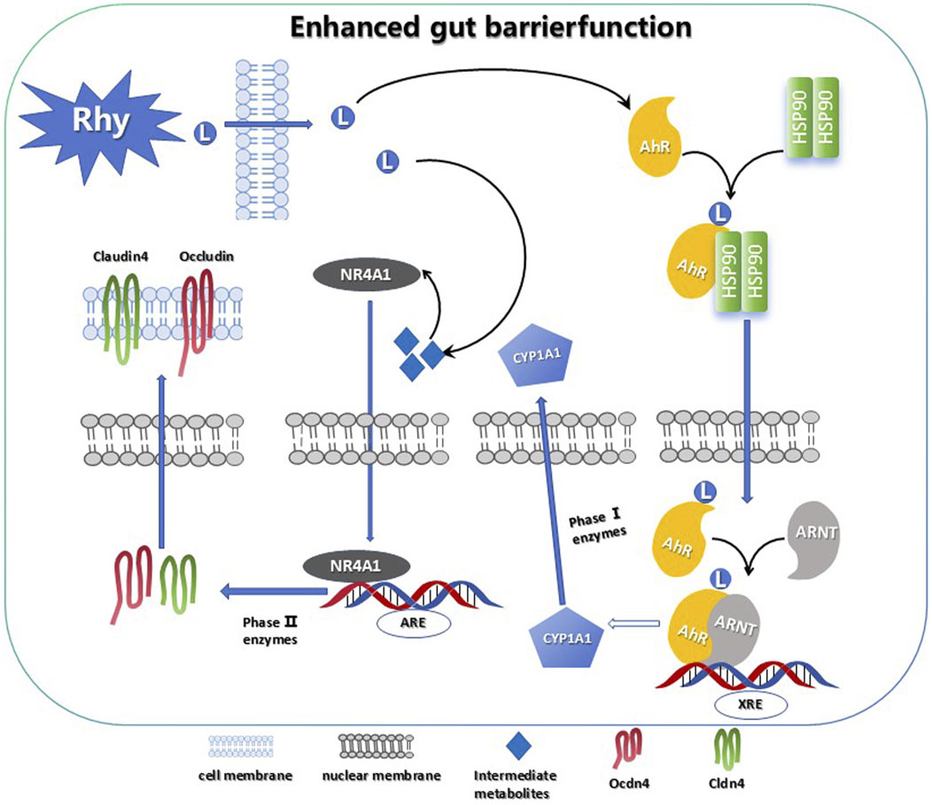 Animal studies have demonstrated that Rhy treatment significantly enhances tight junction proteins, reduces intestinal permeability, and diminishes local and systemic inflammation, thus alleviating symptoms of colitis. A dosage of 2 mg kg-1 Rhy has shown therapeutic effects on DSS-induced colitis, and it has been observed that Rhy enhances intestinal barrier function, which helps prevent the development of colitis. In mice pre-treated with Rhy before DSS-induced colitis, there was a significant reduction in intestinal permeability, consistent with Rhy’s increase in the expression of tight junction proteins. Even after discontinuing Rhy treatment post-DSS-induced colitis, mice still showed delayed progression of the disease, suggesting that Rhy may exert preventive effects on colitis by enhancing intestinal barrier function. Daily administration of Rhy resulted in upregulated expression of AhR, NR4A1, and tight junction proteins such as ZO-1, Occludin, and Claudin4 in the colons of mice. These findings highlight Rhy’s potential to strengthen intestinal barrier integrity, which could play a crucial role in preventing the onset of colitis. Rhy not only mitigates both chronic and acute colitis induced by DSS but also demonstrates efficacy across different models, indicating its broad benefits. Unlike high-affinity and potentially toxic AhR ligands like FICZ, Rhy, as a low-affinity and non-toxic AhR ligand, offers a novel therapeutic strategy for treating colitis.