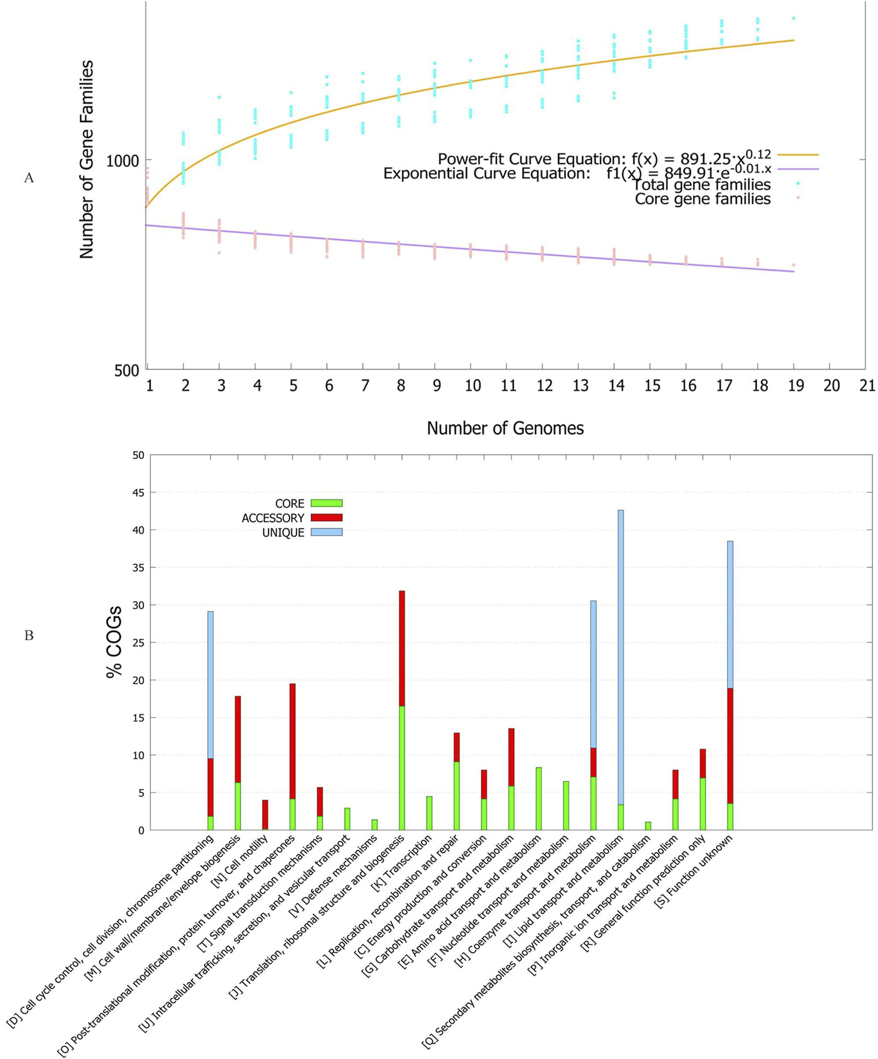 (A) Pan-genome accumulation curve of Tropheryma whipplei based on analysis of multiple genomes. The curve is modeled using an exponential regression equation, illustrating the growth of the pan-genome as more genomes are added. The x-axis represents the number of genomes included in the analysis, while the y-axis shows the cumulative number of gene families (orthologous groups). The shape of the curve provides insights into whether the species has an open or closed pan-genome, reflecting genomic diversity and gene acquisition potential. (B) Functional classification of genes within different genome fractions, expressed as percentages based on Clusters of Orthologous Groups (COG) categories. Genome fractions include the core genome (genes present in all strains), accessory genome (genes present in some but not all strains), and unique genome (strain-specific genes). Each bar represents the relative abundance of genes associated with specific COG functional categories, such as metabolism, cellular processes, information storage, and poorly characterized functions. This distribution reveals how functional roles are partitioned across conserved and variable regions of the genome.