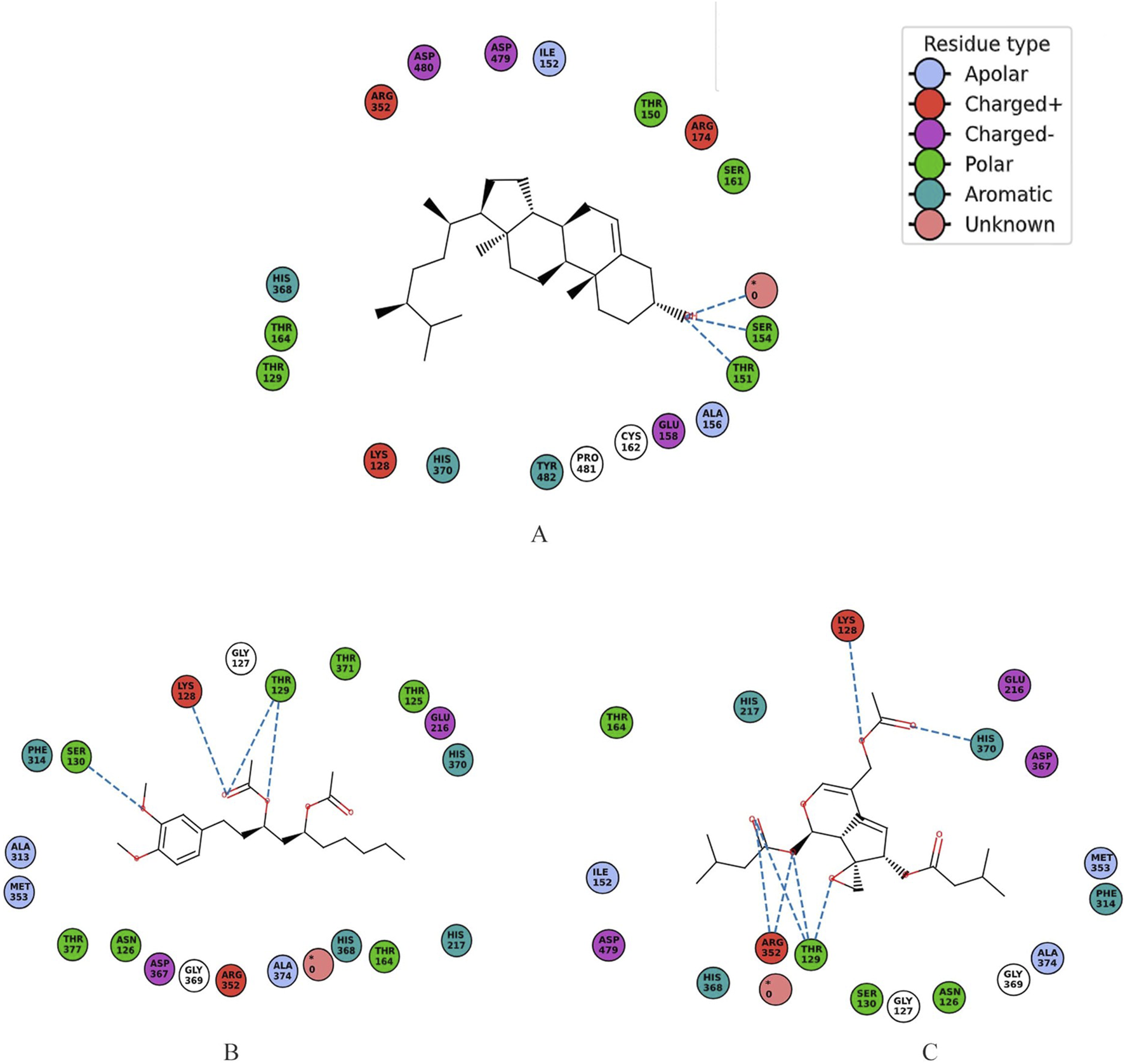 2D schematic representations illustrating the molecular interactions between UDP-N-acetylmuramyl-tripeptide synthetase and three bioactive compounds, detailing specific residue contacts and types of interactions for protein and (A) Ergost-5-en-3-ol, (3beta,24xi), (B) [6]-Gingerdiol 3-monoacetate and (C) Valtrate. The unknown residue shown in pink was not included in the interaction analysis.