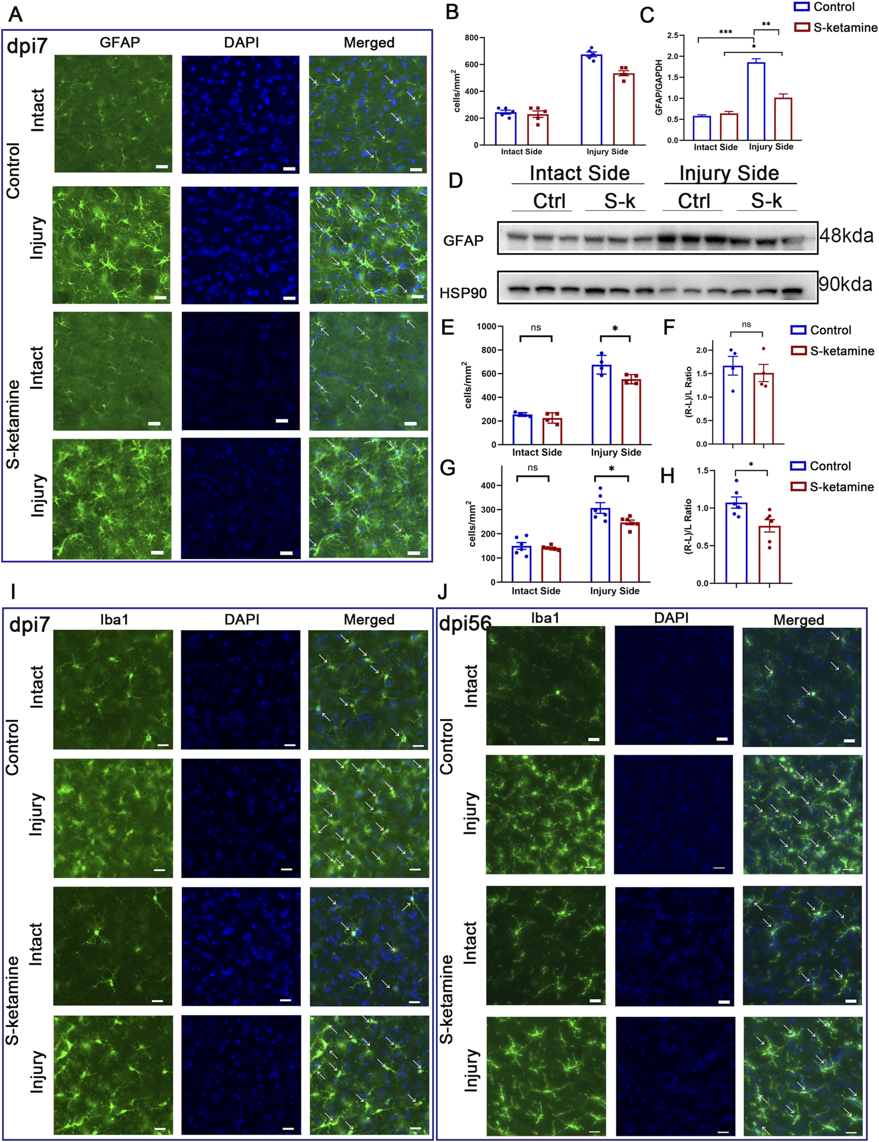 1. S-ketamine ameliorates the reactive astrocyte and microglial activation on the injured side of the spinal cord.