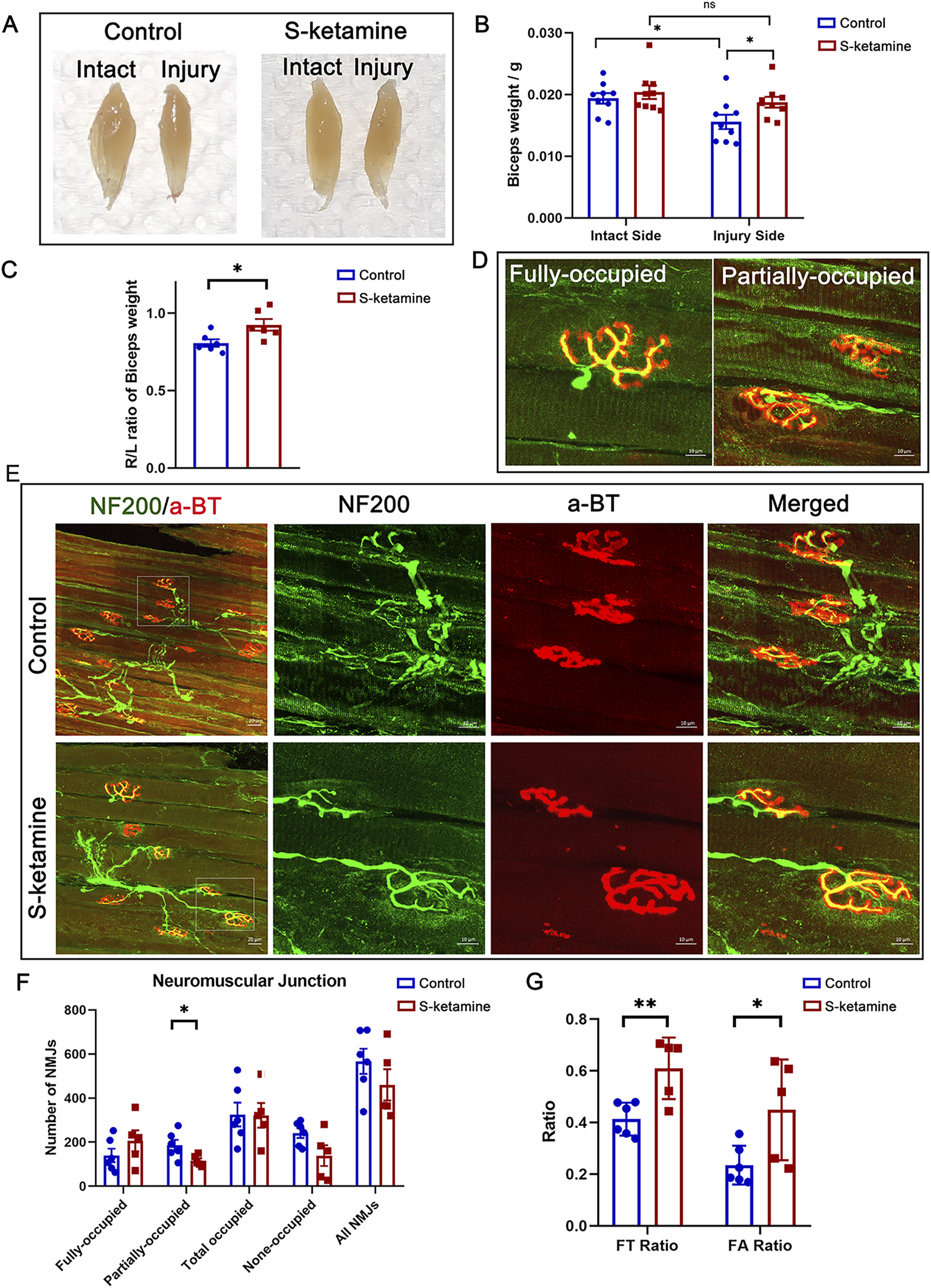 S-ketamine reverses muscle atrophy and preserves NMJ integrity. (A) Representative photographs of biceps muscles. (B) Weight of the biceps. (C) Ratio of the ipsilateral muscle weight to that of the contralateral sides. (D) Definition of the fully and partially occupied NMJs. (E) Immunofluorescence of NF200 and α-BT-labeled NMJs inside the biceps on the injured sides. (F) Number of different types of NMJs. (G) FT ratio (fully occupied NMJs to total-occupied NMJs) and FA ratio (fully occupied NMJs to all NMJs) of the two groups. NMJ, neuromuscular junction. *p < 0.05.