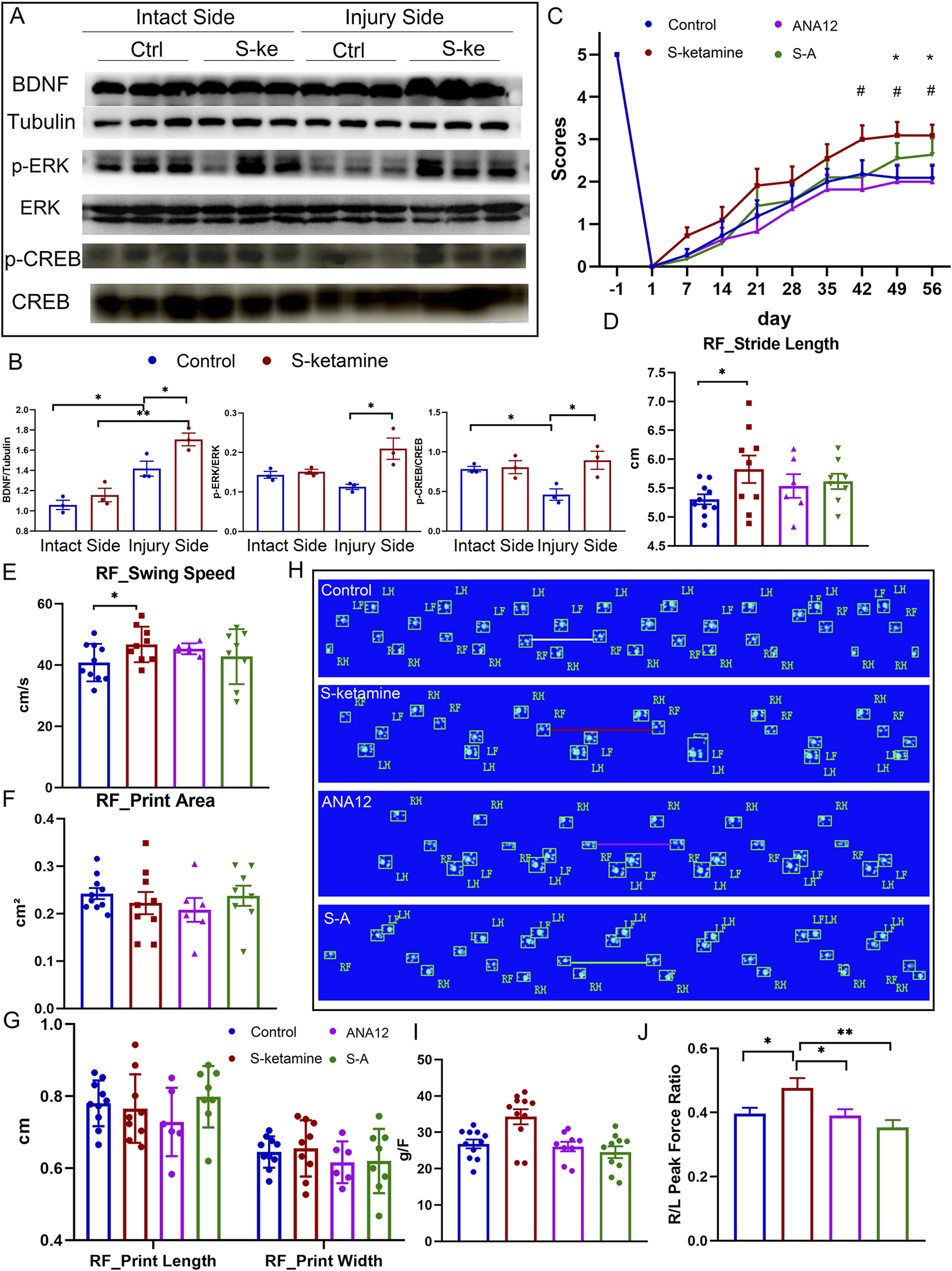 S-ketamine elevates the BDNF concentration by reversing ERK/CREB phosphorylation. (A, B) Western blot of BDNF, p-ERK, ERK, p-CREB, CREB, tubulin, and quantification of the blots. (C) Weekly grooming test scores of the mice in each group. (D–G) Quantification of the stride length, swing speed, print area, print length, and print width of the injured side in each group. (H) Footprints of the mice in each group on dpi56. (I) Peak force of the forelimbs in each group. (J) Ratio of the peak force of the injured forelimb to that of the intact side in each group. **, p < 0.01 and * and #, p < 0.05. Ctrl, control; S-k, S-ketamine.