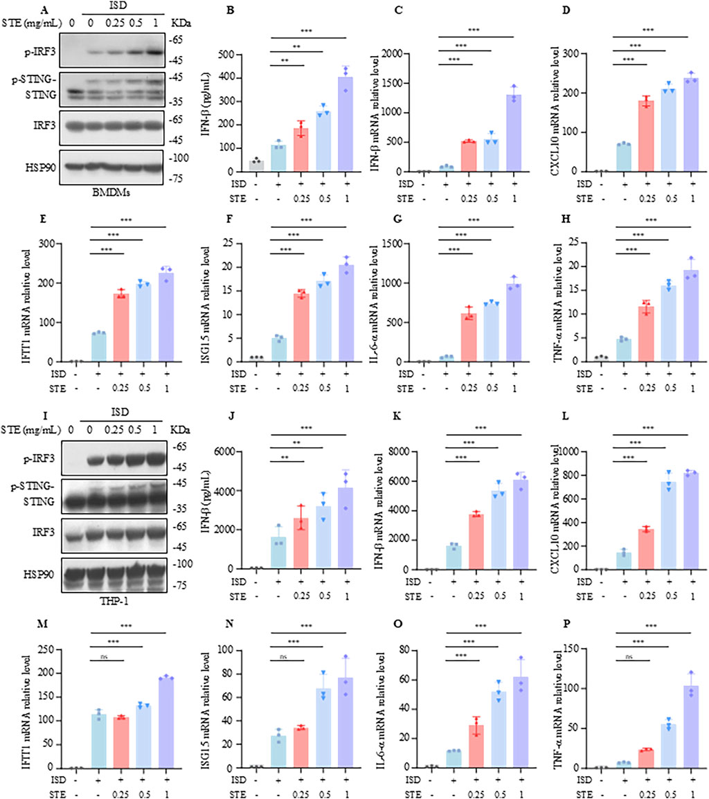 Figure 1. STE promotes cGAS-STING pathway activation in BMDMs and THP-1. (A) BMDMs were first treated with STE or vehicle for 1 h, followed by transfection with ISD for 2.5 h. Cell lysates were collected and assayed for the expression levels of the proteins shown therein. (B) BMDMs were first treated with STE or vehicle for 1 h and then transfected with ISD for 8 h, in which IFN-β levels were detected. (C–H) BMDMs were first treated with STE or vehicle for 1 h, then transfected with ISD for 4 h. Cells were lysed with Trizol and IFN-β, CXCL10, IFIT1, ISG15, IL-6 and TNF-α levels were detected in them. (I) PMA-primed THP-1 were first treated with STE or vehicle for 1 h, followed by transfection with ISD for 2.5 h. Cell lysates were collected and assayed for the expression levels of the proteins shown therein. (J) PMA-primed THP-1 were first treated with STE or vehicle for 1 h and then transfected with ISD for 8 h, in which IFN-β levels were detected. (K–P) PMA-primed THP-1 were first treated with STE or vehicle for 1 h, then transfected with ISD for 4 h. Cells were lysed with Trizol and IFN-β, CXCL10, IFIT1, ISG15, IL-6 and TNF-α levels were detected in them. Data in (B-H), (J-P) are expressed as mean ± SD from three biological replicates. Statistical analyses were performed on multiple samples using one-way ANOVA with Dunnett’s post hoc test. *p < 0.05, **p < 0.01 and ***p < 0.001 vs. the control, ns, not significant.
