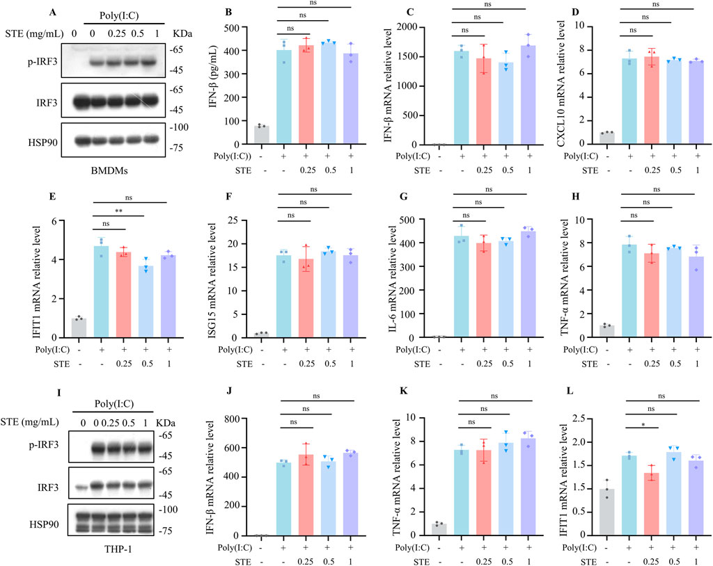 Figure 2. STE does not affect cytoplasmic RNA-induced increases in interferon levels. (A) BMDMs were first treated with STE or vehicle for 1 h, followed by transfection with Poly(I:C) for 2.5 h. Cell lysates were collected and assayed for the expression levels of the proteins shown therein. (B) BMDMs were first treated with STE or vehicle for 1 h and then transfected with Poly(I:C) for 8 h, in which IFN-β levels were detected. (C–H) BMDMs were first treated with STE or vehicle for 1 h, then transfected with Poly(I:C) for 4 h. Cells were lysed with Trizol and IFN-β, CXCL10, IFIT1, ISG15, IL-6 and TNF-α levels were detected in them. (I) PMA-primed THP-1 were first treated with STE or vehicle for 1 h, followed by transfection with Poly(I:C) for 2.5 h. Cell lysates were collected and assayed for the expression levels of the proteins shown therein. (J–L) PMA-primed THP-1 were first treated with STE or vehicle for 1 h, then transfected with Poly(I:C) for 4 h. Cells were lysed with Trizol and IFN-β, TNF-α and IFIT1 and levels were detected in them. Data in (B-H,J-L) are expressed as mean ± SD from three biological replicates. Statistical analyses were performed on multiple samples using one-way ANOVA with Dunnett’s post hoc test. *p < 0.05, **p < 0.01 and ***p < 0.001 vs. the control, ns, not significant.