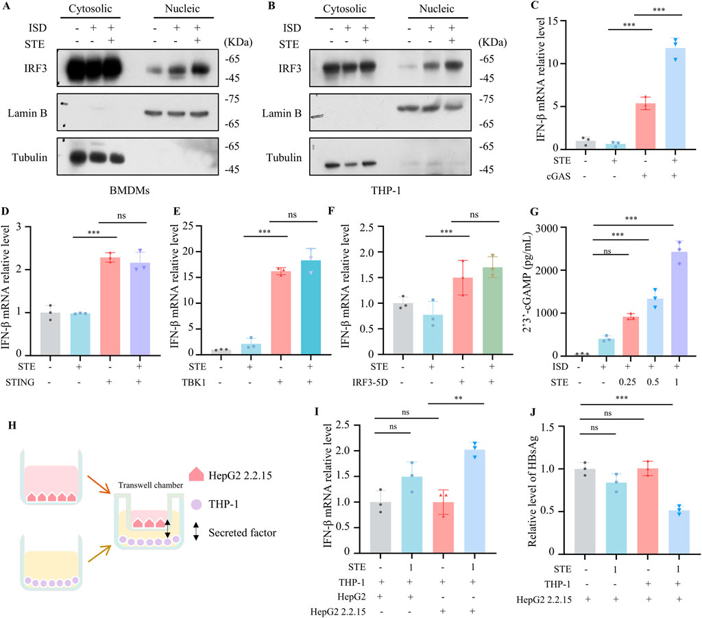 Figure 3. STE promotes cGAS-STING pathway activation via facilliating 2′3′-cGAMP synthesis (A,B) BMDMs or THP-1 were first treated with STE for 1 h and then with ISD for 2.5 h. Subsequently, cell membranes and nuclei were isolated and the amount of IRF3 protein in them was detected. (C–F) The cGAS, STING, TBK1 or IRF3-5D plasmids were transfected into HEK-293 cells for 18 h, then STE (1 mg/mL) was administered, and the expression level of IFN-β in them was detected by qPCR after 6 h (n = 3). (G) BMDMs were treated with STE for 1.5 h followed by ISD for 1.5 h and 2′3′-cGAMP levels in the samples were detected using ELISA kits (n = 3). (H–J) THP-1 cells inoculated in 24-well plates were first treated with STE. Transwell chambers inoculated with HepG2.2.2.15 cells were placed in well plates containing THP-1 cells, and after 24 to detect the HBsAg and IFN-β levels (n = 3). Data are expressed as mean ± SD from three biological replicates. Statistical analyses were performed on multiple samples using one-way ANOVA with Dunnett’s post hoc test. *p < 0.05, **p < 0.01 and ***p < 0.001 vs. the control, ns, not significant.
