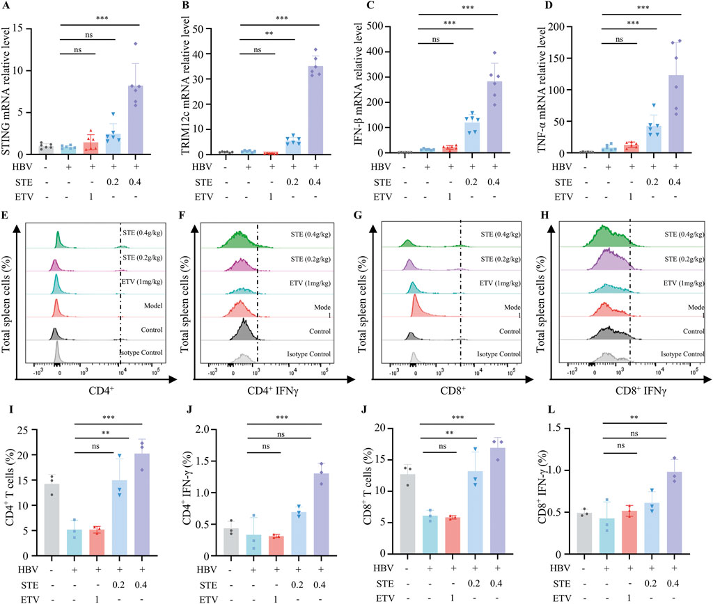 Figure 5. STE increases IFN-γ levels in spleen tissue of HBV mice. (A–D) The collected mouse liver tissues were homogenized, and the total RNA was lysed and extracted by Trizol. qPCR was used to detect the levels of STING (I), TRIM12c (J), IFN-β (K), and TNF-α (L) in the liver tissues (n = 6). (E–H) Flow cytometry was performed to analyze the levels of CD4+, CD8+ T cells as well as IFN-γ+CD4, IFN-γ+CD8+ cells in spleen tissues (n = 3). (I–L) Statistical analysis of the frequency of CD4+, CD8+ T cells as well as IFN-γ+CD4, IFN-γ+CD8+ (n = 3). Data are presented as mean ± SD, Statistical analyses were performed on multiple samples using one-way ANOVA with Dunnett’s post hoc test. *P < 0.05, **P < 0.01, ***P < 0.001, ns: not significant.