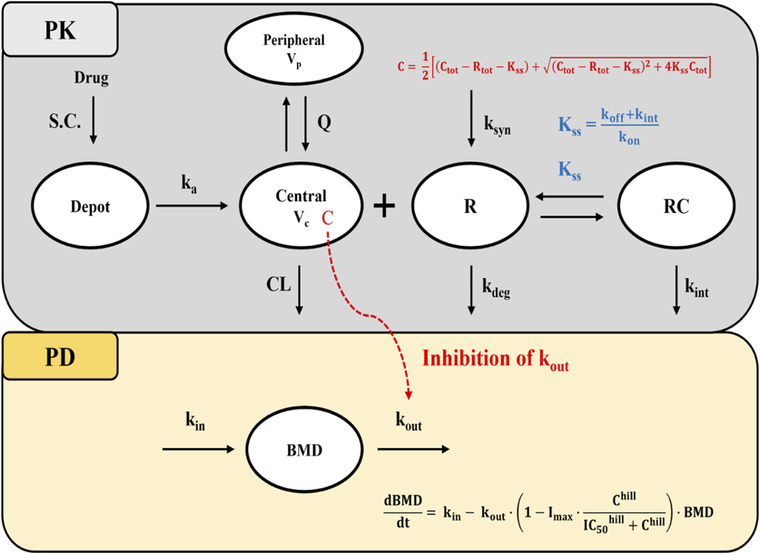Schematic diagram of the QSS TMDD model and turnover model with inhibitory effect on kout. Abbreviations: S.C, subcutaneous; BMD: bone mineral density; ka: first-order absorption rate constant; CL: clearance; Q: inter-compartmental clearance; Vc: volume of distribution in the central compartment; Vp: volume of distribution in the peripheral compartment; Kss: quasi-steady-state equilibrium constant; kon: second-order association rate constant; koff: first-order dissociation rate constant; kdeg: first-order target degradation rate constant; kint: first-order internalization rate constant of the drug-target complex; ksyn: zero-order target synthesis rate constant; IC50: drug concentration that produces 50% of the maximum inhibition; Imax: Maximum inhibitory effect of drug; kin: zero-order rate constant for BMD synthesis; kout: first-order rate constant for BMD elimination; hill: hill coefficient; C:free drug concentration; Ctot: total drug concentration; Rtot: total target receptor concentration; Note that R and RC compartments represent the total target receptor activator of nuclear factor kappa-B ligand (RANKL) and RANKL-drug complexes, respectively.