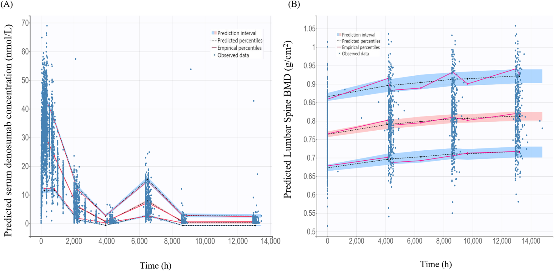 All samples were analyzed at certified laboratories using validated analytical methods. Serum denosumab concentrations were measured employing a validated electrochemiluminescence immunoassay (ECLIA) specifically developed for the detection and quantification of denosumab. The lower limit of quantification (LLOQ) for this assay was 20 ng/mL. Among these, 615 pre-dose samples (9.34%) with concentrations below the LLOQ were set to zero for model initialization.