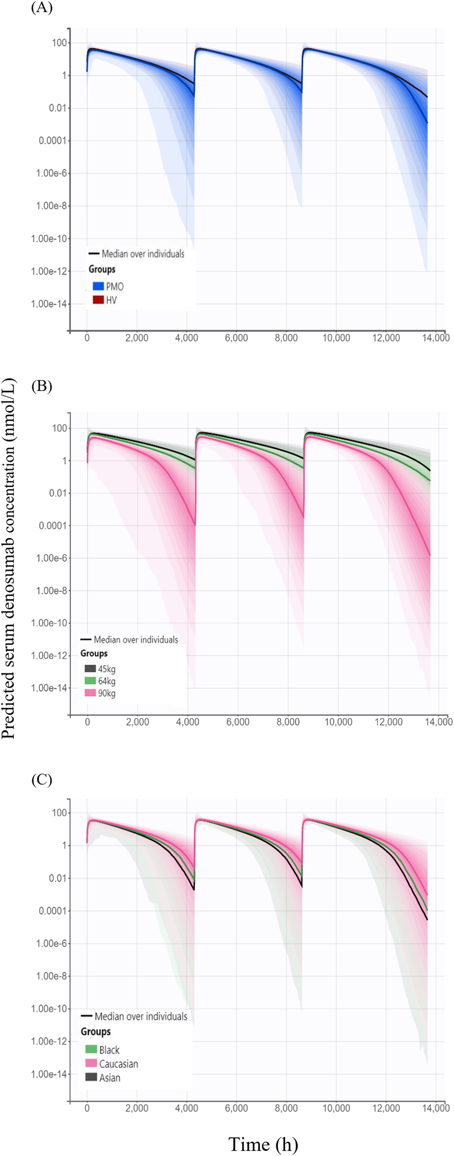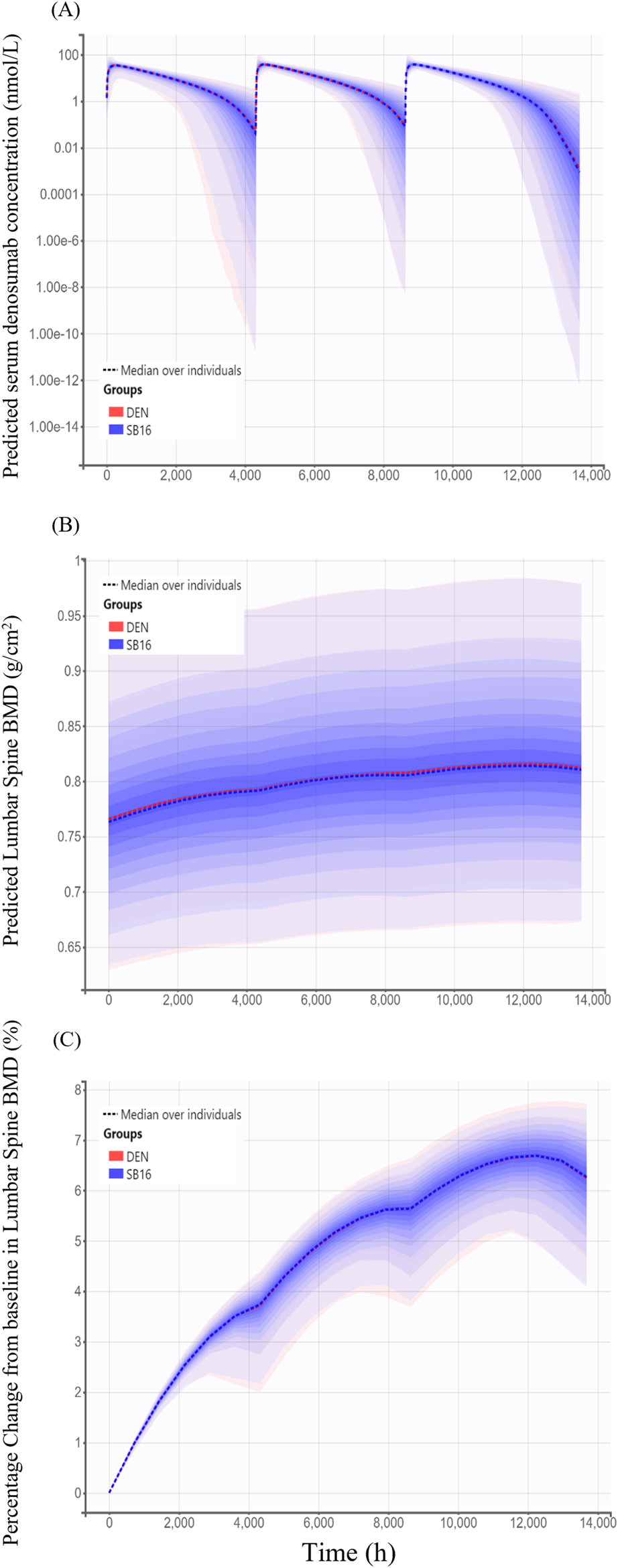 For the simulations used to compare PK and PD profiles of SB16 and DEN, the treatment group was intentionally retained as a covariate in the final PK/PD model, irrespective of its statistical significance in the covariate analysis. For each subject, PK metrics such as Cmax, time to peak drug concentration (Tmax) and area under the concentration-time curve within a dosing interval (τ) at steady state (AUCτ,ss) and change from baseline in lumbar spine BMD were calculated from the simulation data. The median and 90% PI were then summarized and compared between the two treatment groups.