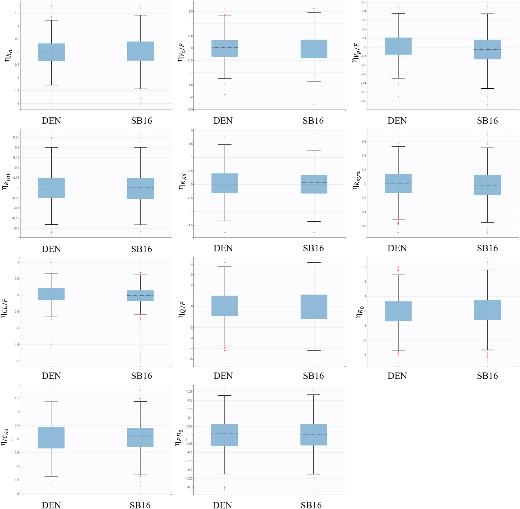 The treatment effects of the biosimilar SB16 and reference DEN, pooled from EU/US-DEN data, on the CL and Imax were assessed during covariate analysis. Furthermore, empirical Bayes estimates (EBEs) for key PK and PD parameters were visually compared between the two treatments using boxplots.