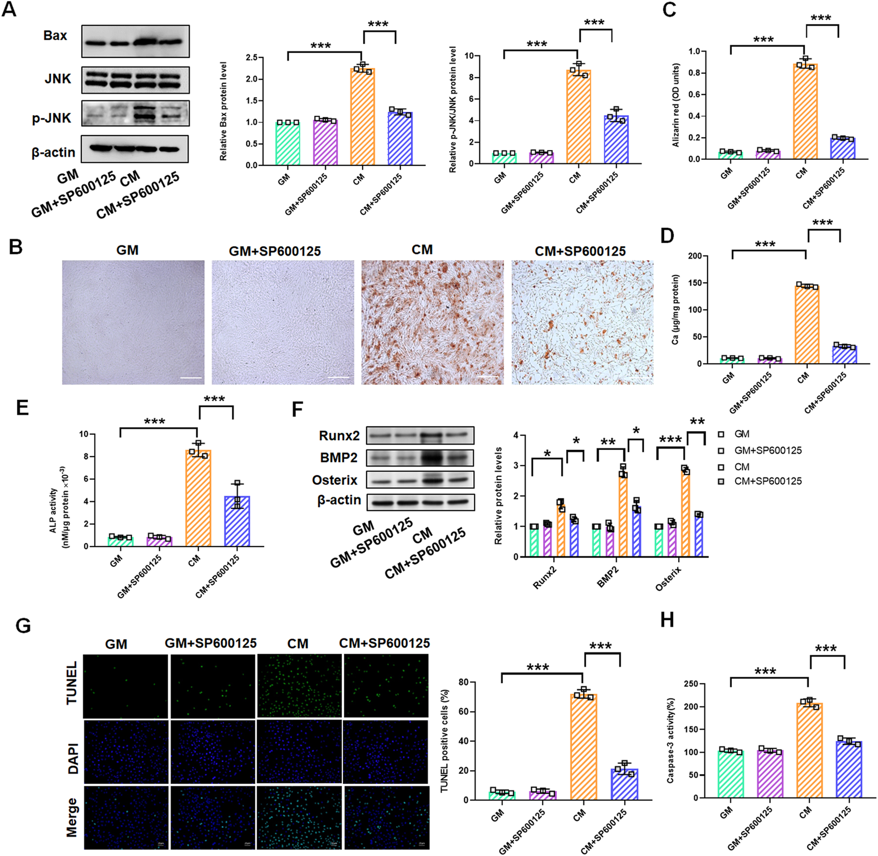 SP600125 treatment mediates the change of the JNK/Bax signaling pathways in CM-treated VSMCs. VSMCs were treated with GM and/or GM + SP600125 (10 μM) and CM and/or CM + SP600125 (10 μM), respectively. (A) Quantification analysis of the Western blot results of JNK, p-JNK, and Bax in VSMCs (B,C). Alizarin red staining and quantification of alizarin red analysis of calcium deposition in VSMCs. Scale bar = 200 μm. (D) Calcium content analysis of the results of calcium deposition in VSMCs. (E) ALP activity analysis of the results of ALP levels in VSMCs. (F) Quantification analysis of the Western blot results of Runx2, BMP2, and Osterix in VSMCs. (G, H) TUNEL staining and caspase-3 activity analysis of cell apoptosis in VSMCs. Scale bar = 20 μm *P < 0.05, **p < 0.01, and ***p < 0.001.