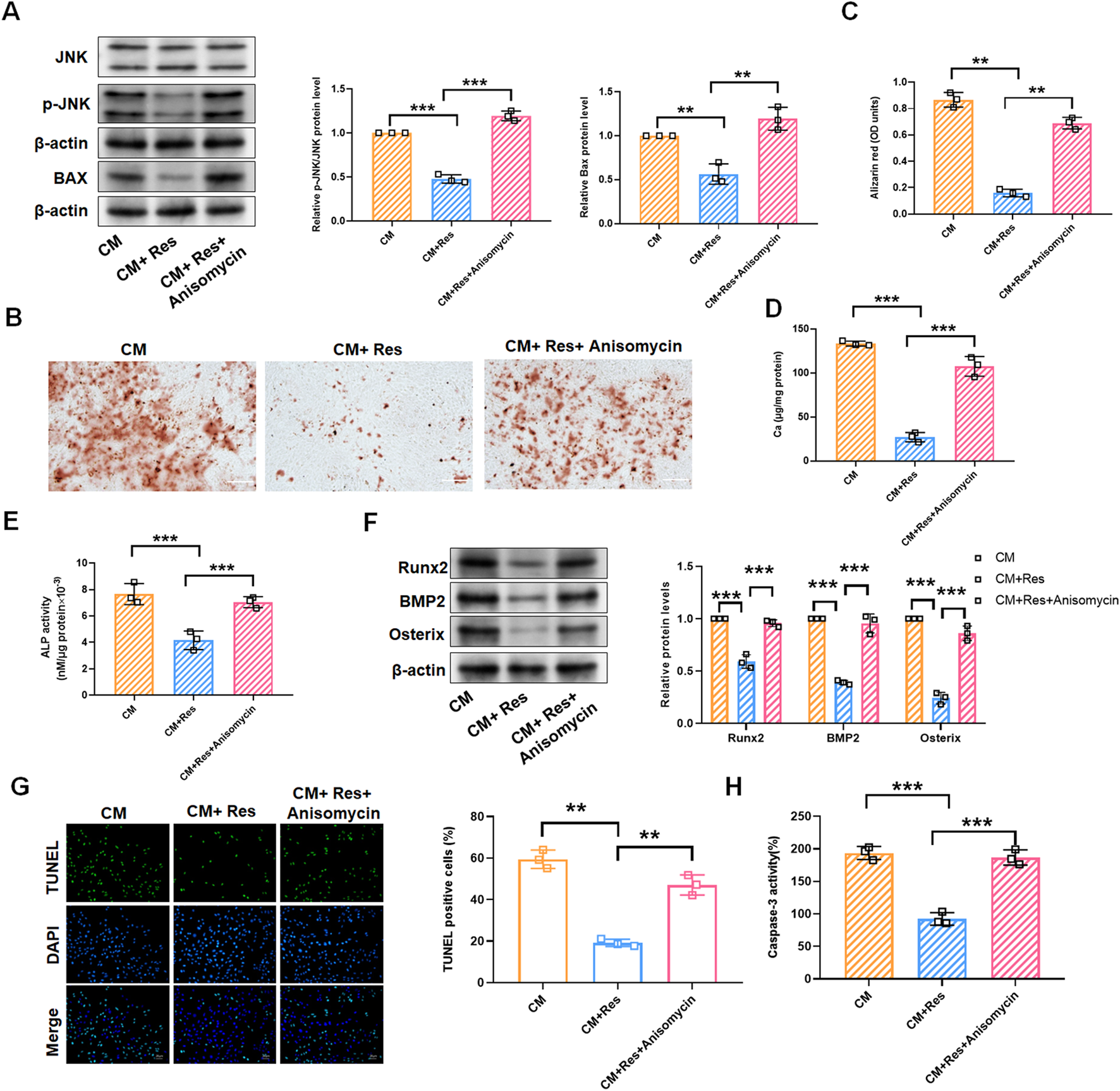 JNK/Bax pathway reverses the effect of resveratrol on CM-treated VSMC calcification and apoptosis. VSMCs were treated with CM, CM + Res (10 μM), or CM + Res + anisomycin (100 ng/mL), respectively. (A) Quantification analysis of the Western blot results of JNK, p-JNK, and Bax in VSMCs. (B, C) Alizarin red staining and quantification of alizarin red analysis of calcium deposition in VSMCs. Scale bar = 200 μm. (D) Calcium content analysis of the results of calcium deposition in VSMCs. (E) ALP activity analysis of the results of ALP levels in VSMCs. (F) Quantification analysis of the Western blot results of Runx2, BMP2, and Osterix in VSMCs. (G, H) TUNEL staining and caspase-3 activity analysis of cell apoptosis in VSMCs. Scale bar = 20 μm **P < 0.01 and ***p < 0.001.
