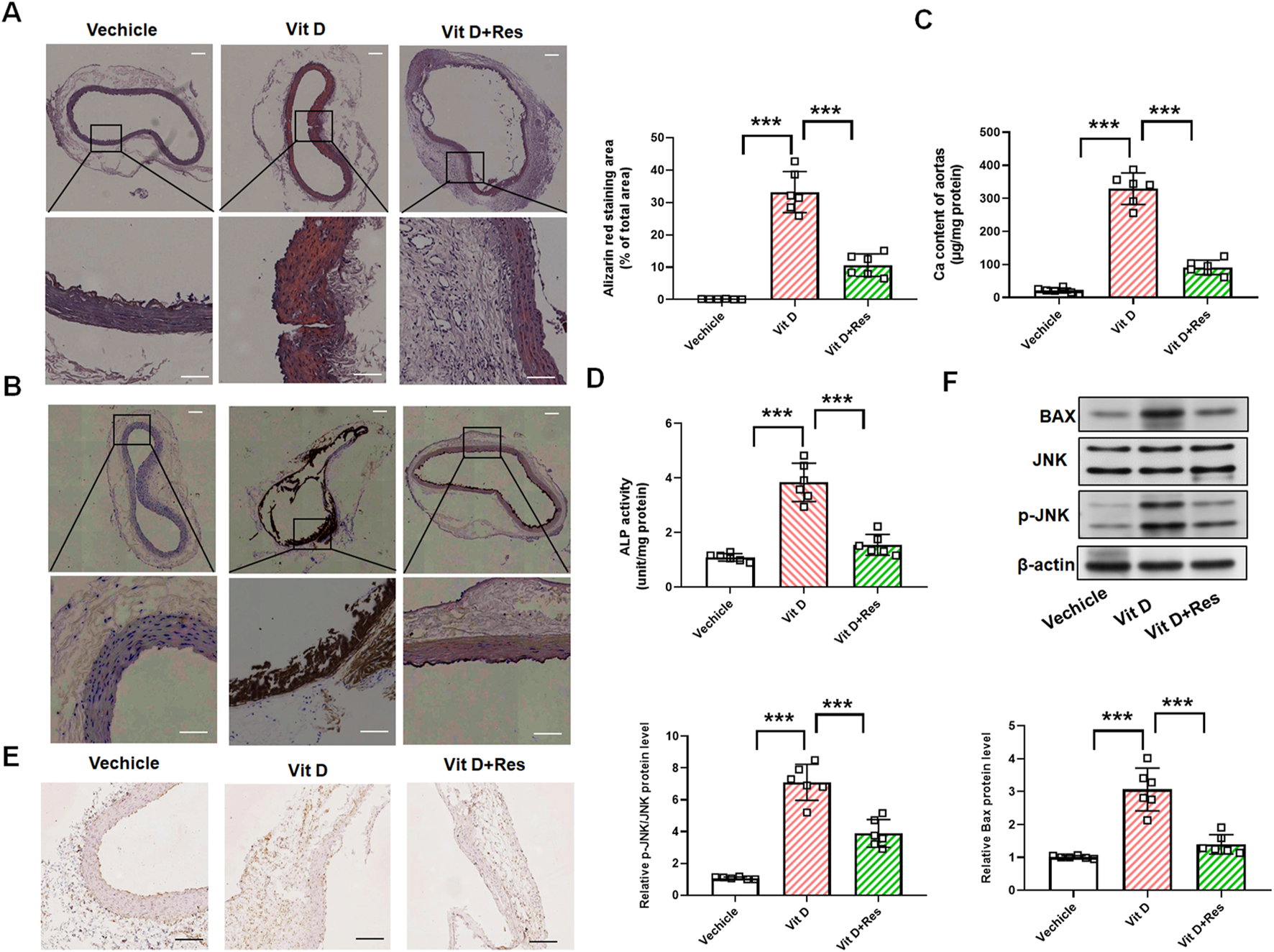 Impact of resveratrol on vascular calcification in vitamin D3-induced mice. (A) Alizarin red staining and quantification of alizarin red analysis of calcium deposition in the aortic rings. Scale bar = 100 μm; scale bar = 50 μm. (n = 6). (B) von Kossa staining analysis of calcium deposition in the aortic rings. Scale bar = 100 μm; scale bar = 50 μm. (n = 6). (C) Calcium content analysis of the results of calcium deposition in the aortas. (D) ALP activity analysis of the results of ALP levels in the aortic rings. (n = 6). (E) Representative images of immunohistochemistry results of the protein levels of Runx2 in the aortic rings. Scale bar = 100 μm. (n = 6). (F) Quantification analysis of the Western blot results of JNK, p-JNK, and Bax in the aortas. (n = 6). ***P < 0.001.
