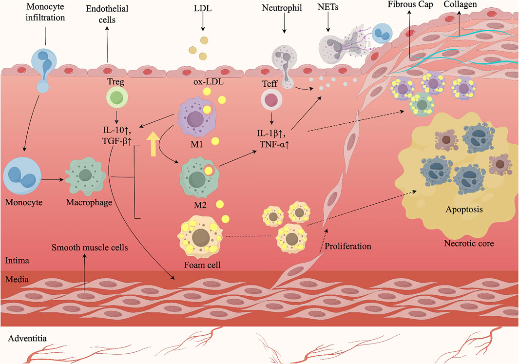 Figure 1. AS arises from multicellular interactions and complex signaling cascades within the arterial wall. Endothelial injury initiates the process by recruiting circulating monocytes, which adhere to activated endothelium, infiltrate into the intima, and differentiate into macrophages. Following uptake of oxLDL, macrophages transform into foam cells, whose accumulation seeds the lipid core and triggers early plaque growth. During lesion progression, macrophages and effector T cells (Teff) secrete pro-inflammatory cytokines such as IL-1β and TNF-α, which stimulate SMCs migration from the media, their proliferation, and subsequent thickening of the vessel wall. M1-polarized macrophages and Teff further amplify inflammatory signaling. By contrast, M2-polarized macrophages and regulatory T cells (Treg) secrete anti-inflammatory mediators including IL-10 and TGF-β, which suppress excessive inflammation and facilitate M1-to-M2 repolarization, thereby contributing to lesion stabilization. In advanced plaques, persistent SMC proliferation and extracellular matrix deposition form a fibrous cap over the necrotic core. However, neutrophil extracellular traps (NETs) exacerbate endothelial injury and promote cell death, destabilizing the plaque and predisposing to cap rupture. Rupture exposes thrombogenic material, triggering platelet aggregation and thrombus formation, which may result in acute cardiovascular events. The figure was created with Figdraw.com.