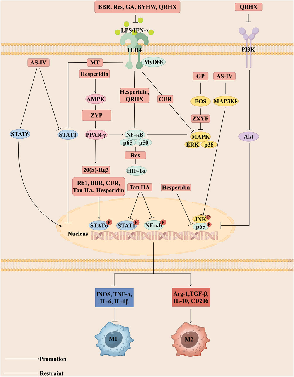 Figure 2. Different bioactive metabolites, including Rb1, Rg3, BBR, CUR, MT, Tan IIA, Res, GA, GP, AS-IV, and Hesperidin as well as herbal formulas such as BYHW, ZYP, ZXYF, and QRHX regulate signaling pathways central to macrophage polarization. These interventions act on key nodes such as TLR4, MAPK, PPAR-γ, and JAK/STAT, thereby modulating intracellular phosphorylation events, including STAT6 and NF-κB nuclear translocation. Through these mechanisms, they alter the expression of inflammatory mediators, promote the polarization of macrophages toward the anti-inflammatory M2 phenotype, and suppress pro-inflammatory M1 activity. Collectively, this rebalancing of macrophage function contributes to the attenuation of vascular inflammation, stabilization of atherosclerotic plaques, and overall improvement in the pathological process of atherosclerosis (AS). The figure was created with Figdraw.com.