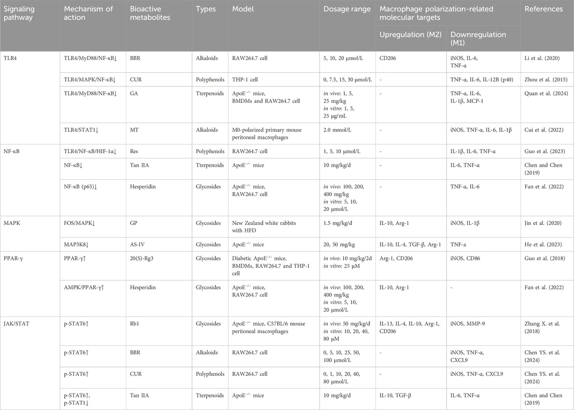 The use of medicinal plants continues as an alternative treatment for various diseases, including cardiovascular disease (Shaito et al., 2020). With the progress of modern society and advances in medical research, various botanical drugs have demonstrated potential application value in the treatment of AS. Bioactive metabolites, isolated from botanical drugs, are structurally defined small molecules with specific biological activities, serving as crucial sources for drug discovery (such as alkaloids, flavonoids, terpenoids, polyphenols, and glycosides) (Pawlita et al., 1985; Cheng et al., 2017). The application value of TCM in the prevention and treatment of AS has been supported by modern pharmacological research. Increasingly, bioactive metabolites and herbal formulas are reported to delay AS, providing a scientific basis for the development of related drugs. This article systematically summarizes bioactive metabolites and herbal formulas regulate macrophage polarization in the treatment of AS. The intervention mechanisms of bioactive metabolites and herbal formulas on macrophage polarization-related signaling pathways (Figure 2).