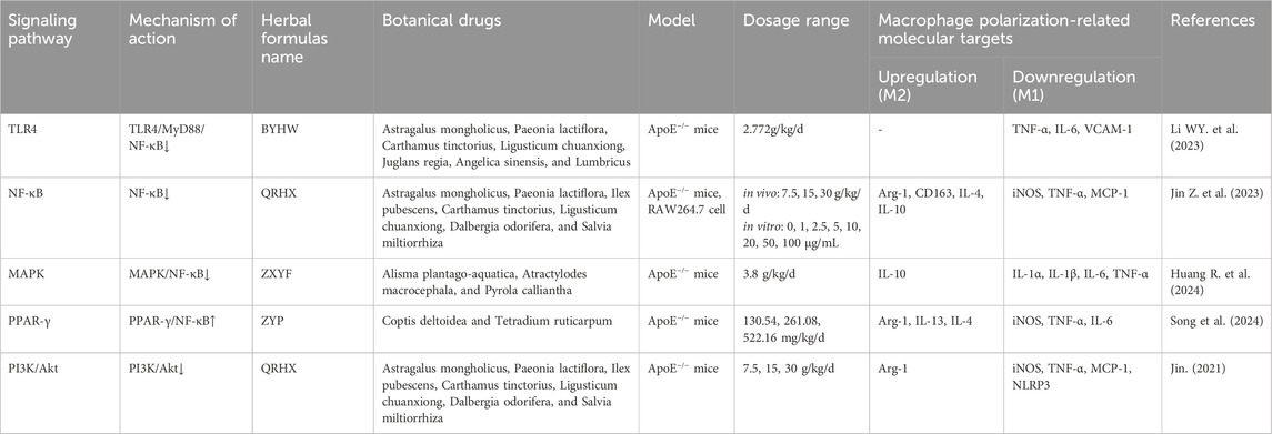 Qingre Huoxue Decoction (QRHX) has been clinically applied for more than two decades, is composed of seven botanical drugs: Astragalus mongholicus Bunge. (Lamiaceae, Huangqin), Paeonia lactiflora Pall. (Paeoniaceae, Chishao), Ilex pubescens Hook. & Arn. (Aquifoliaceae, Maodongqing), Carthamus tinctorius L. (Asteraceae, Honghua), Ligusticum chuanxiong S.H.Qiu, Y.Q.Zeng, K.Y.Pan, Y.C.Tang & J.M.Xu (Apiaceae, Chuanxiong), Dalbergia odorifera T.C.Chen (Fabaceae, Jiangxiang), and Salvia miltiorrhiza Bunge. (Lamiaceae, Danshen) (He W. et al., 2024). QRHX contains high levels of baicalin and salvianolic acid B, both of which exert anti-AS effects by regulating the NF-κB signaling pathway and macrophage polarization (He W. et al., 2024). The multi-metabolite and multi-target nature of QRHX provides a mechanistic basis for its anti-inflammatory, lipid-regulating, and plaque-stabilizing activities. In an in vivo study on ApoE−/− mice, QRHX induces macrophage polarization toward the M2 phenotype by inhibiting the NF-κB signaling pathway, thereby alleviating plaque inflammation. Additionally, QRHX targets and inhibits key proteins in the PI3K/Akt signaling pathway, promotes M2 polarization, and reduces the expression of M1 phenotype-related inflammatory factors (TNF-α, MCP-1, and NLRP3), exerting anti-inflammatory, lipid-regulating, and plaque-stabilizing effects (Jin, 2021). Furthermore, QRHX increases miR-26a-5p expression, decreases PTGS2 expression, and promotes the remodeling of M1-type macrophages to the M2 phenotype, thereby improving AS pathology (He W. et al., 2024). These preclinical findings provide biological plausibility for the clinical effects observed in patients and illustrate a translational pathway from mechanistic studies to therapeutic application. QRHX has demonstrated efficacy in the treatment of AS, showing potential to stabilize plaques and reduce the incidence of adverse cardiovascular events, based on evidence from clinical studies (Zuo et al., 2021). Importantly, QRHX is one of the few traditional formulas for which both clinical and preclinical evidence converge, with clinical observations guiding mechanistic investigations in animal models. This review summarizes the signaling pathways related to the treatment of AS by herbal formulas by regulating macrophage polarization (Table 2).