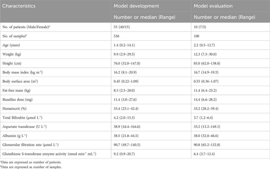 The demographic characteristics and clinical data of the study population are presented in Table 1. In total, 636 busulfan whole-blood samples were obtained from 65 HCT recipients. Notably, all participants were randomly divided into two groups, and 100 samples from 10 HCT recipients were used for model evaluation. Concentrations below the lower quantification limit were not included in the analysis. The median of patient postnatal age was 1.5 years (range, 0.2–14.1), with 21 patients aged <1 year. A correlation chart of patient characteristics is presented in Supplementary Figure S1.