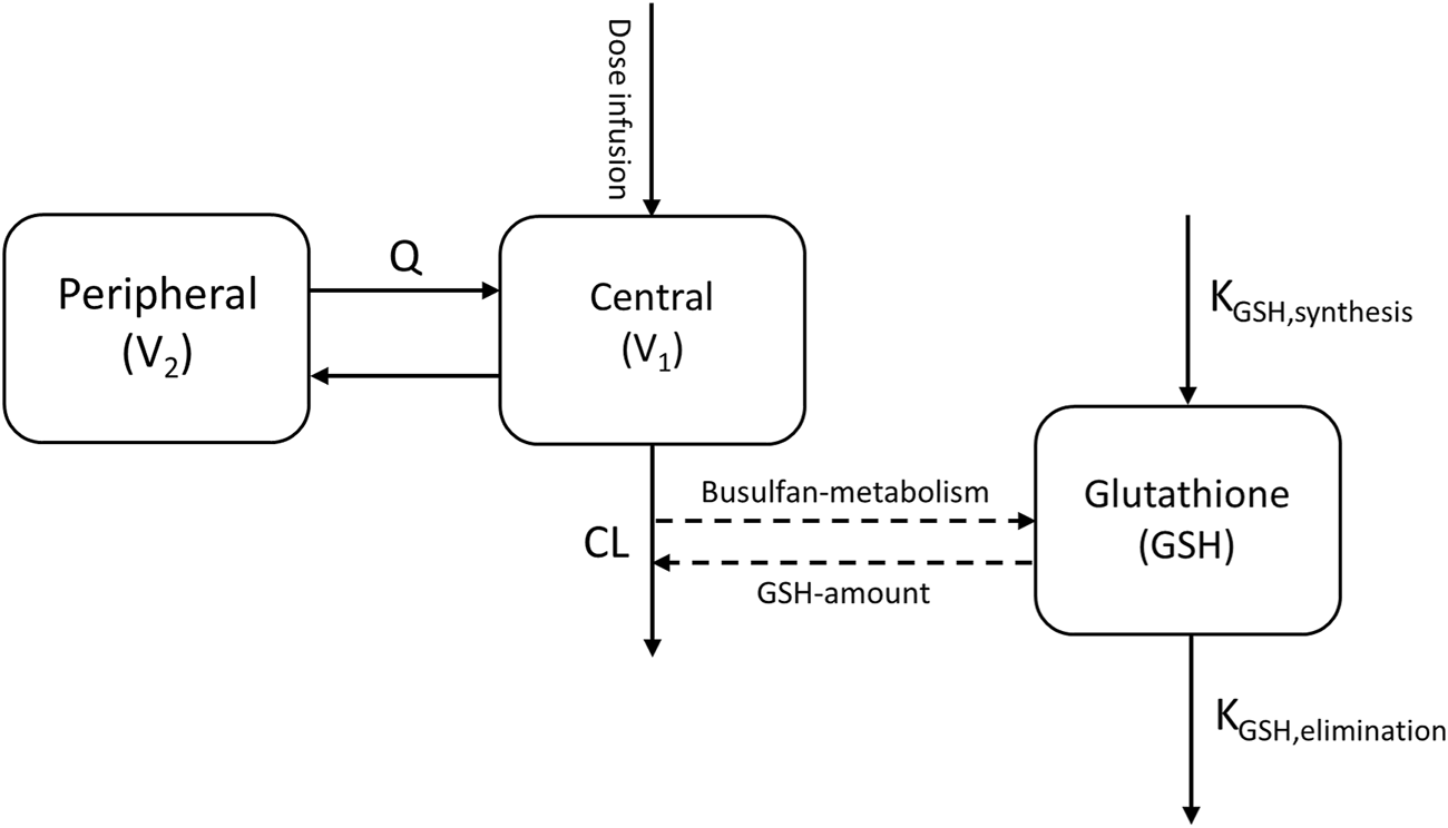 Busulfan semi-mechanistic population pharmacokinetic model structure. CL, clearance; Q, inter-compartmental clearance; V1, central compartment; V2, peripheral compartment. Dashed lines indicate the conjugation of busulfan metabolism and glutathione.