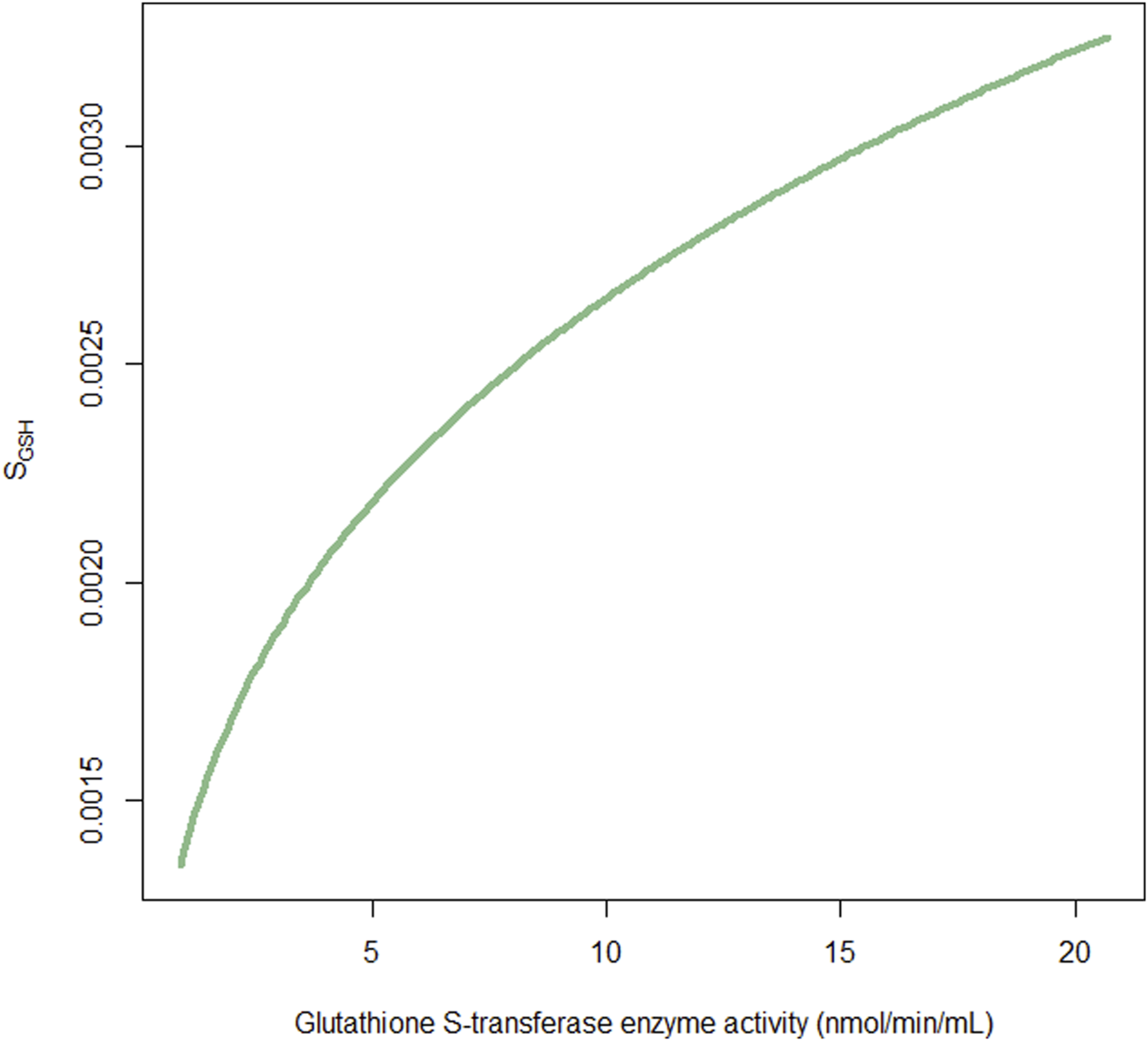 The AIC value was not reduced; however, the GSH compartment was added to describe the relative amount of GSH available at any time, based on theoretical mechanisms. The SGSH was fixed at 0.026 h/mg following the study by Langenhorst et al. (2020), which indicates a net relevant GSH reduction of 0.26% per hour for each milligram of busulfan metabolism scaled to a 1L central volume of distribution. The influence of GST activity on SGSH was also determined exponentially. The SGSH was increased by 40.6% as GST enzyme activity increased from 0.9 nmol/min/mL to 20.7 nmol/min/mL (Figure 3). The IIV of the GST slope on the SGSH was 103.9%, possibly owing to the small sample size.