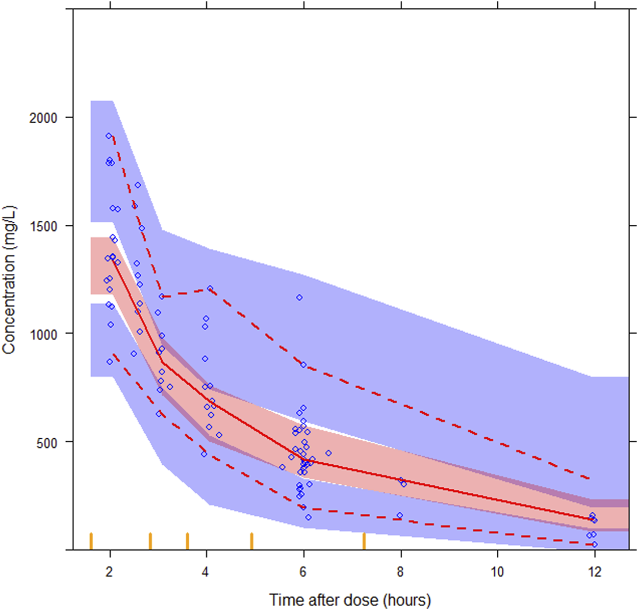 In addition to GOF plots, model adequacy was rigorously evaluated through prediction-corrected visual predictive checks (pcVPCs), employing 2,000 Monte Carlo simulations to account for parameter uncertainty (Bergstrand et al., 2011). Statistical agreement was assessed by comparing the 95% confidence intervals (CIs) of simulated trajectories (median, 5th and 95th percentiles) against observed data distributions across automatically determined time intervals. Quantitative validation included visual inspection of percentile superimposition and evaluation of CI envelope coverage to confirm model robustness.