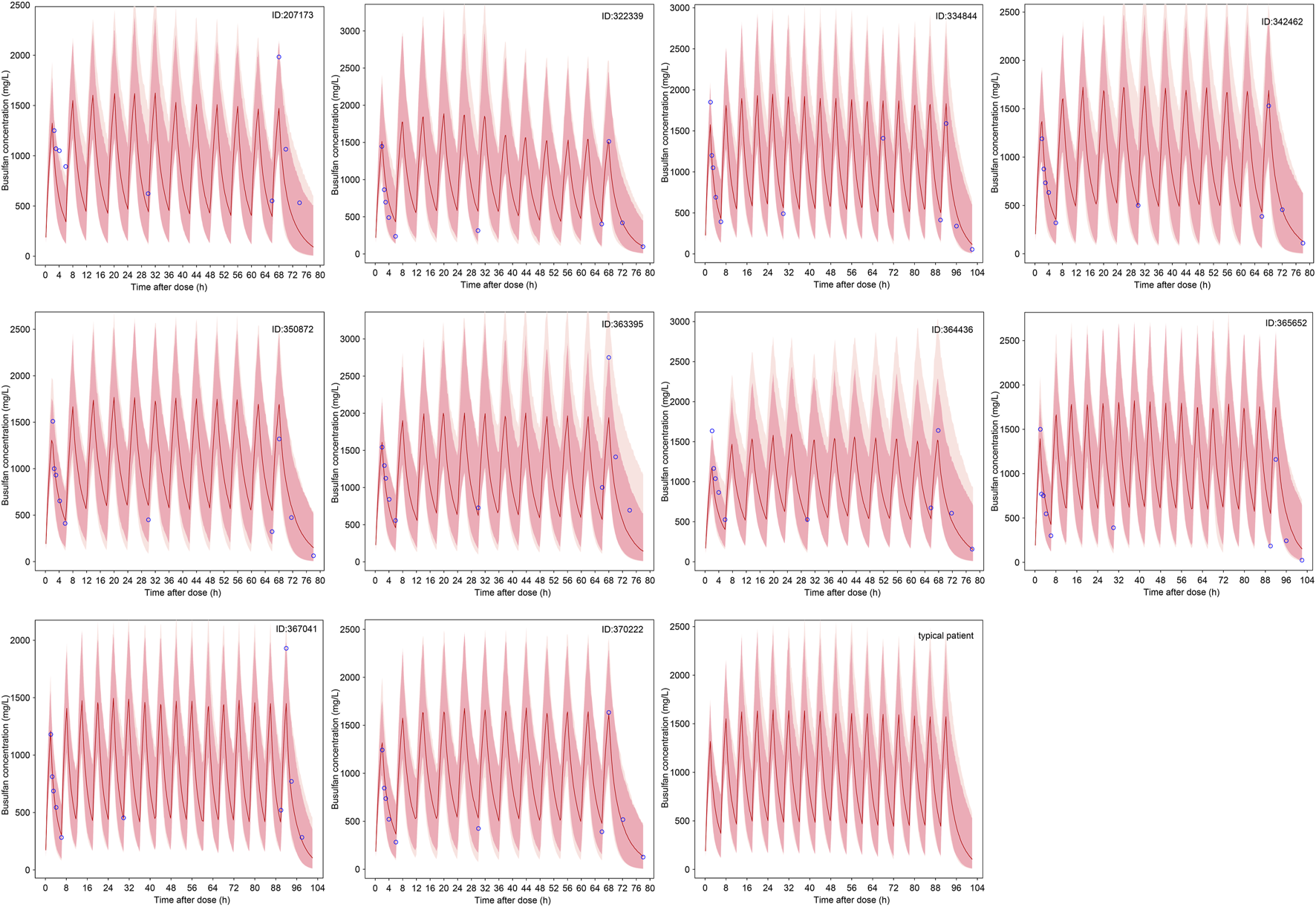 Data were prospectively collected from 65 pediatric HCT recipients who underwent bone marrow transplantation after receiving busulfan IV during preparative chemotherapy at the Children’s Hospital of Fudan University. All patients were administered 0.8–1.2 mg/kg of busulfan via 2 h IV infusion every 6 h, depending on the patient’s WT. Patients with normal organ function were included, and those with unavailable busulfan PK data owning to difficulties in blood sampling were excluded. Demographic and pathophysiological data were prospectively obtained during routine clinical visits between August 2020 and November 2021. This study was approved by the Ethics Committee of the Children’s Hospital (ethics approval number: 2020-271) and conducted in accordance with the Declaration of Helsinki. Notably, all patients and their parents provided written informed consent to participate prior to enrolment in the study.