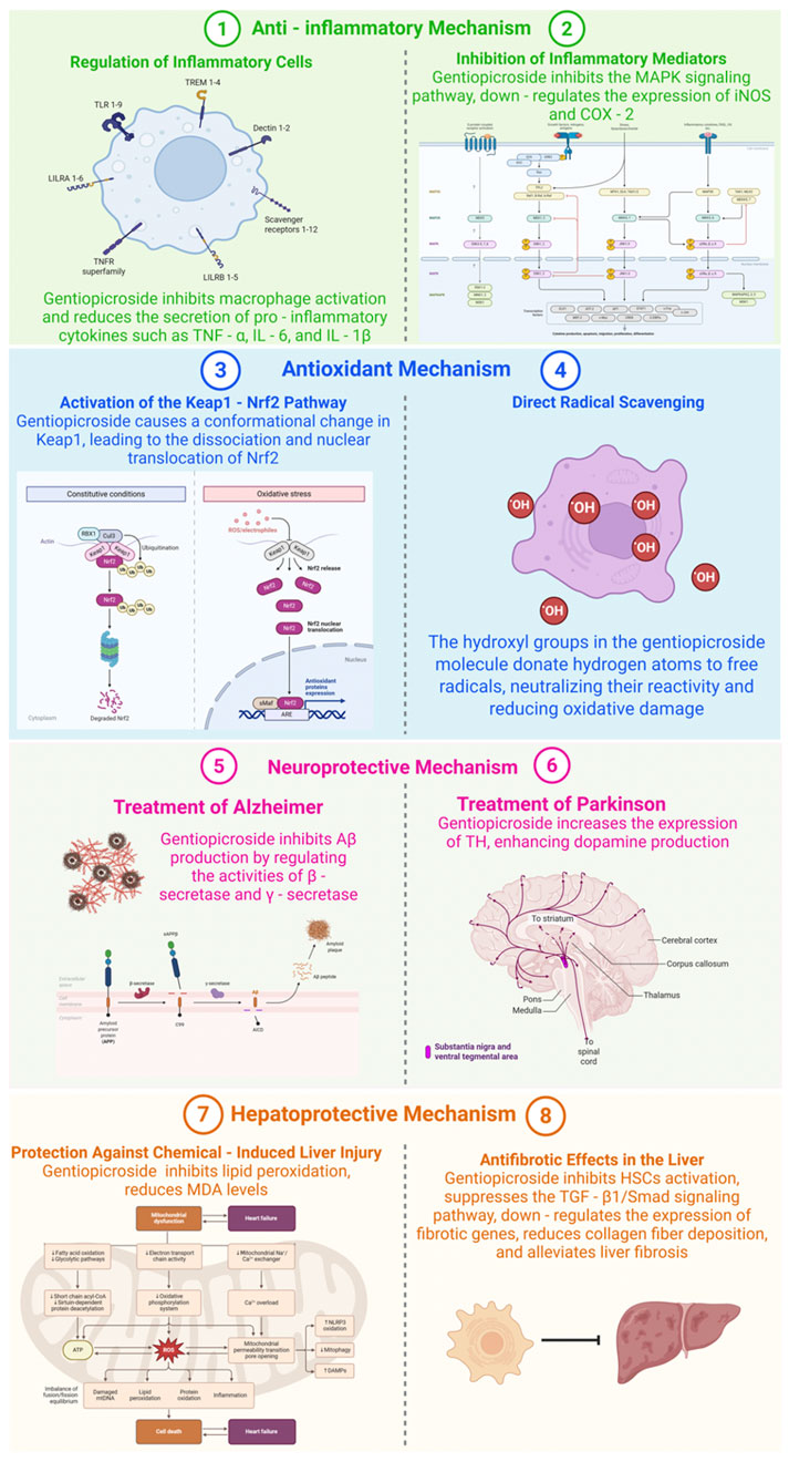 Figure 2. Mechanisms of Gentiopicroside in various diseases (Created with Biorender.com).