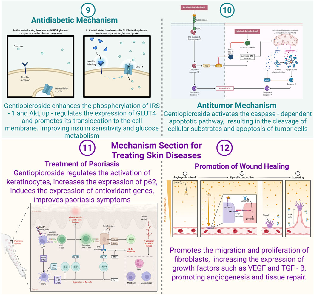 Figure 3. Mechanisms of Gentiopicroside in diabetic, tumor and skin diseases (Created with Biorender.com).