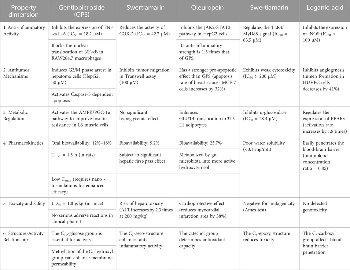 Table 1. Comprehensive comparison table of pharmacological properties of secoiridoid glycosides (He et al., 2015; Suh et al., 2018; Yang R. et al., 2020).