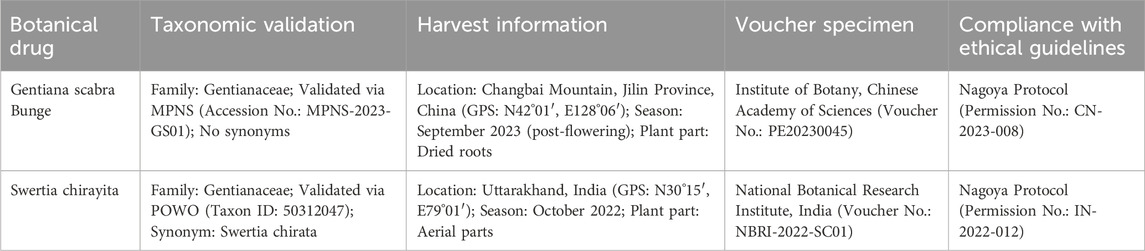 Per ConPhyMP guidelines, GPS was classified as Type A (for G. scabra extracts, included in the Chinese Pharmacopoeia 2020) and Type B (for S. chirayita extracts, commercially used but not pharmacopoeial). Analytical methods included triple chemical fingerprinting and method validation (Table 3; Heinrich et al., 2022).