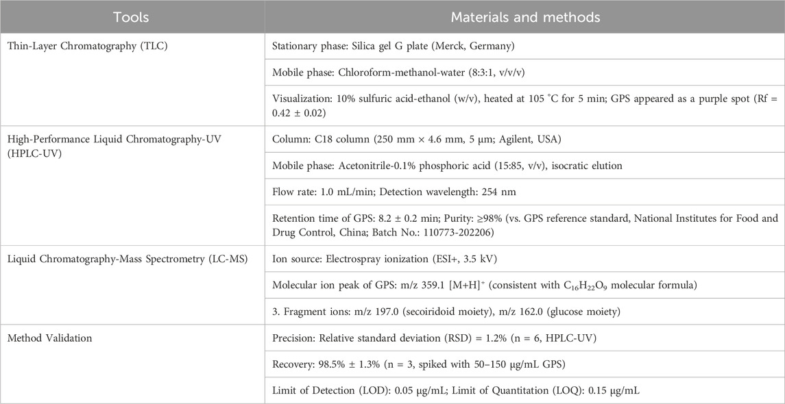 Gentiopicroside (GPS), a secoiridoid glycoside, is extensively found in numerous traditional medicinal plants, including Gentiana scabra Bunge, Swertia chirayita, and Picrorhiza kurroa (Patel et al., 2019; Sharma et al., 2025; Yang et al., 2012; Zeng et al., 2013; Zhang X. et al., 2018). These plants have been integral to traditional medicine for centuries, particularly in regions where such practices are deeply embedded. Historically, they have been employed to address inflammation, with applications ranging from topical decoctions to oral ingestion to alleviate symptoms like swelling, redness, and pain, especially in conditions such as arthritis (Jia et al., 2016; Mirzaee et al., 2017; Zhang X. et al., 2018). Additionally, their hepatoprotective properties, likely due to GPS, have been utilized in treating jaundice, improving liver function, and reducing symptoms like skin and eye yellowing (Han et al., 2018; Lian et al., 2010; Yang et al., 2017). Furthermore, these botanical drugs have been administered for various digestive disorders, from simple indigestion to complex gastrointestinal issues, to alleviate discomfort, enhance appetite, relieve bloating, and improve nutrient absorption (Jovanović et al., 2024; Ruan et al., 2015; Silveira et al., 2019).