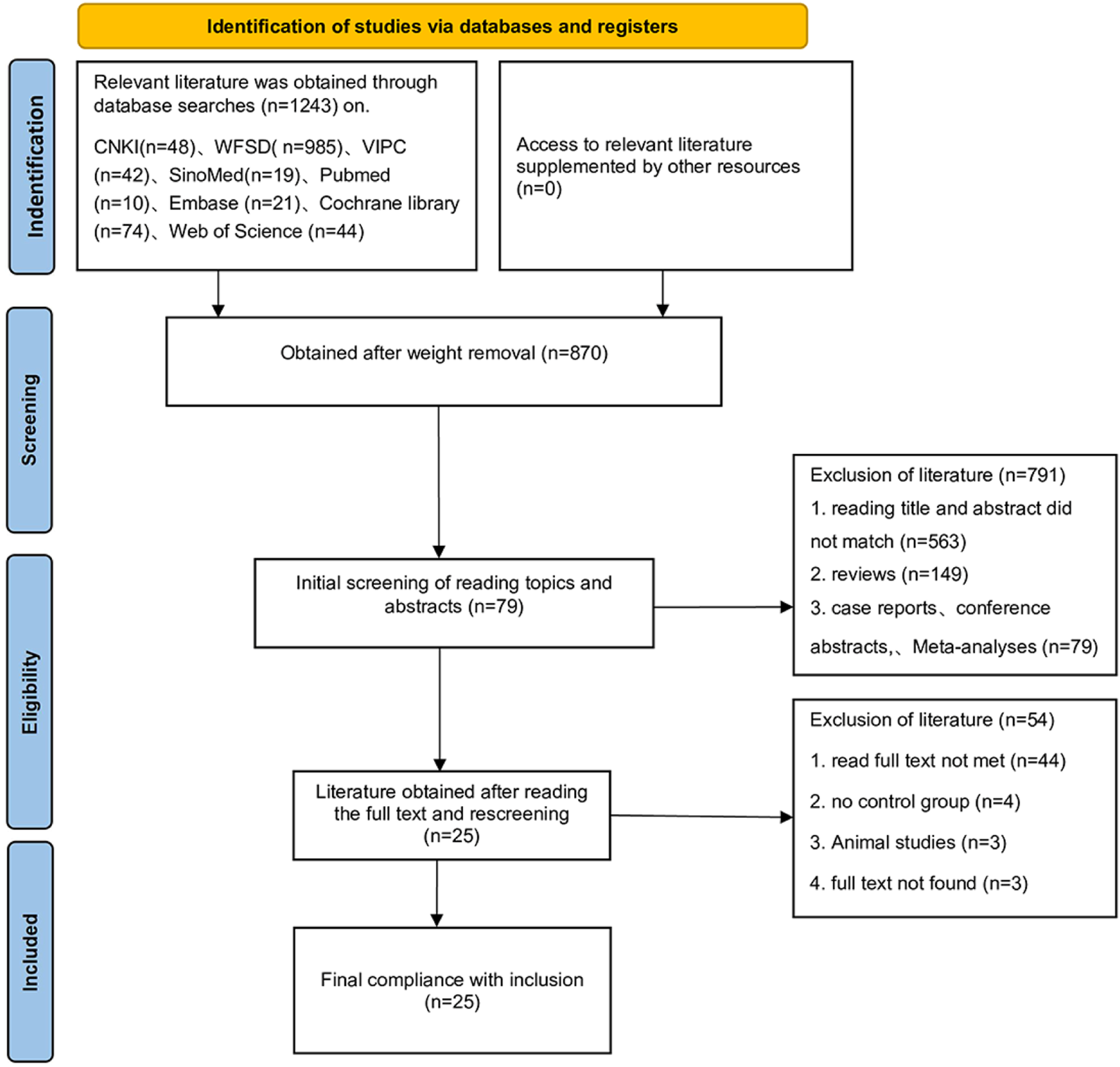 The initial search identified 1,243 potentially relevant records. After removing 373 duplicate publications, 870 unique records remained. Screening of titles and abstracts excluded 791 records, leaving 79 articles for full-text assessment. Following full-text review, 54 articles were excluded, resulting in the final inclusion of 25 published randomized controlled trials (RCTs). The study selection process is detailed in Figure 1. The baseline characteristics of the included studies are summarized in Table 2. These 25 RCTs enrolled a total of 2,245 participants. Regarding the specific SETCM therapy modalities employed: 16 studies utilized acupoint herbal patching, two studies utilized herbal fumigation, two studies utilized TCM iontophoresis, two studies utilized medicated herbal stick application, and two studies utilized acupoint stimulation with herbal ice-cotton swabs. One study utilized targeted drug delivery therapy. Concerning the intervention durations: 15 studies implemented an intervention period of approximately 4 weeks, six studies implemented an intervention period of 3 weeks, and four studies implemented an intervention period of 2 weeks. The results of the included studies indicated that there were no significant differences in baseline measure scores between the experimental (SETCM therapies) and control groups across all studies (P > 0.05). Post-intervention, outcome measure scores improved significantly compared to baseline within both groups (P < 0.05). The improvement observed in the experimental (SETCM therapies) group was significantly greater than that in the control group (P < 0.05).