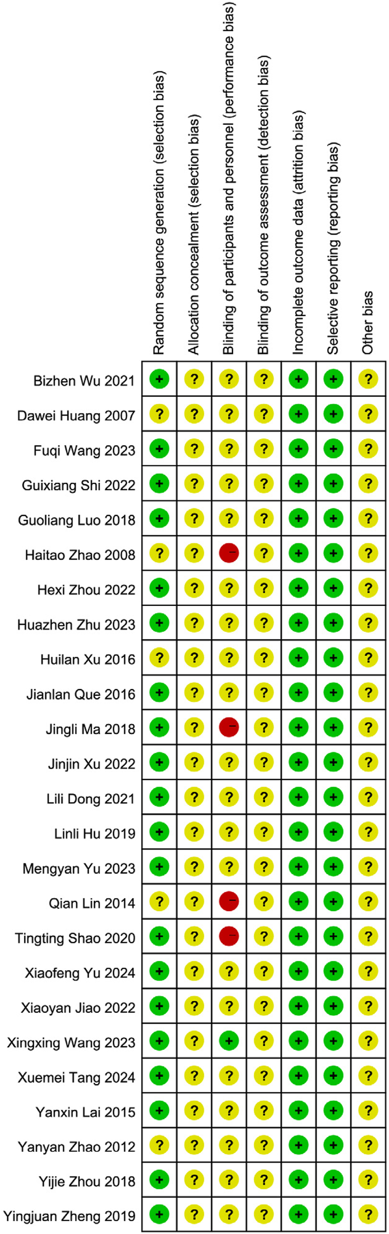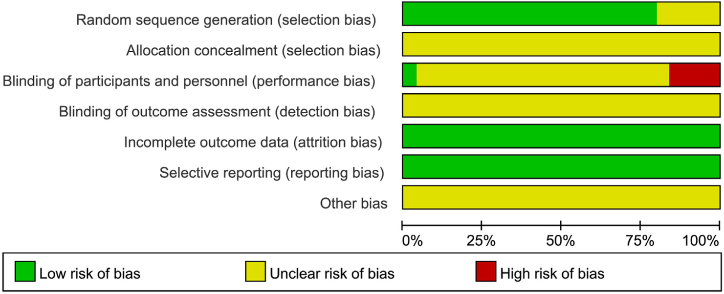 (Note: Studies rated as “unclear risk” in only one domain (e.g., allocation concealment) were retained due to the current limited availability of high-quality RCTs in the PSD field. The potential influence of these studies on conclusions was assessed via sensitivity analysis.)