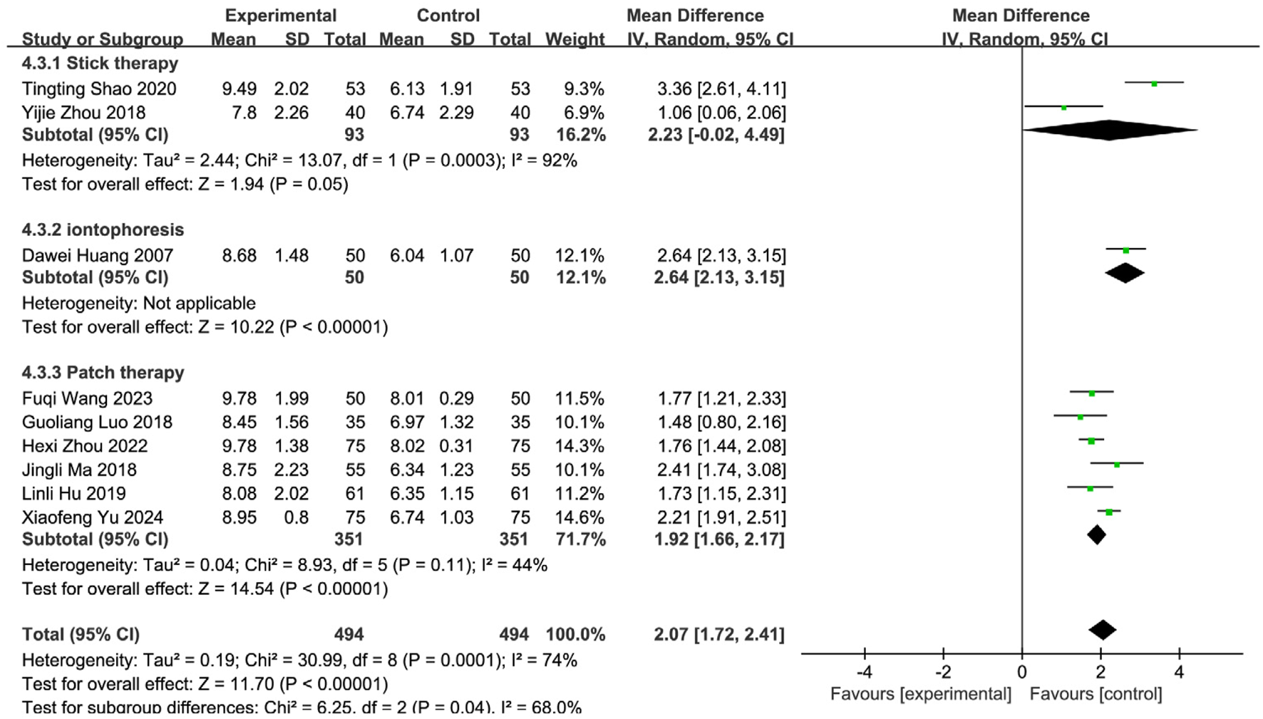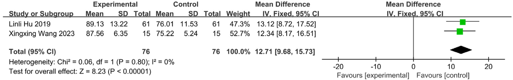 Statistical analyses of the extracted outcome data were performed using Review Manager (RevMan) software, version 5.4.1, provided by the Cochrane Collaboration. Heterogeneity among studies for each clinical outcome was assessed using the chi2 test (Q statistic) and quantified using the I2 statistic. A significance level of P > 0.10 for the chi2 test indicated acceptable heterogeneity, warranting the use of a fixed-effects model (FEM) for meta-analysis. Conversely, a chi2 test result of P ≤ 0.10 indicated significant heterogeneity, leading to the use of a random-effects model (REM) for meta-analysis. The magnitude of heterogeneity was interpreted based on I2 values: I2 ≤ 25% indicated low heterogeneity, I2 > 50% indicated moderate heterogeneity, and I2 > 75% indicated substantial heterogeneity. Where significant heterogeneity was present, sensitivity analyses were conducted using the study removal method to identify potential sources and exclude studies contributing excessively to heterogeneity. For continuous outcomes, results were pooled using the standardized mean difference (SMD) with 95% confidence intervals (CI). For dichotomous outcomes, the relative risk (RR) with 95% CI was used. Results were presented using forest plots. Publication bias was assessed visually using inverted funnel plots plotting the RR (for dichotomous outcomes) or SMD (for continuous outcomes) against its standard error (SE). Two predefined subgroup analyses were performed: (a) stratified by SETCM therapy intervention type (herbal patching, TCM iontophoresis, medicated stick application); and (b) stratified by stroke lesion location (supratentorial [cerebral hemisphere] vs. brainstem). Studies not reporting specific lesion location were excluded from the latter subgroup analysis.