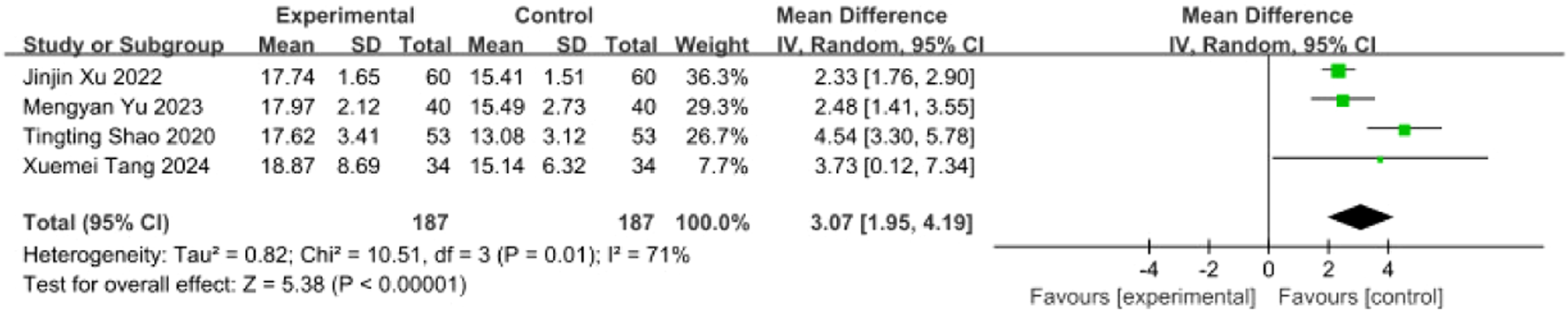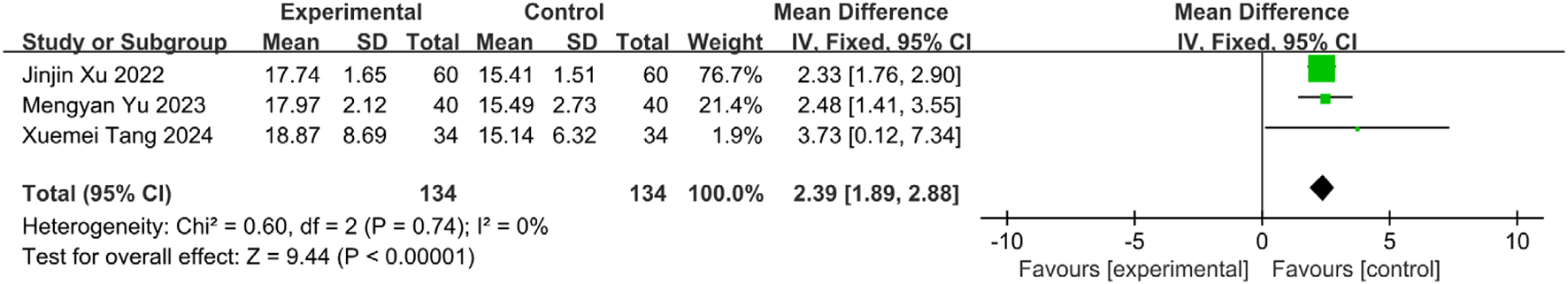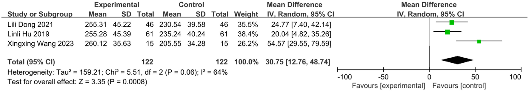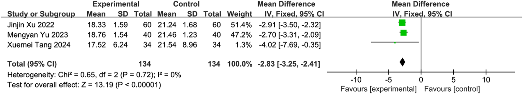 Two independent researchers assessed the quality of evidence (certainty) for each outcome measure using the Grading of Recommendations Assessment, Development and Evaluation (GRADE) approach (Guyatt et al., 2011). Assessments were conducted using the online GRADEpro Guideline Development Tool (GRADEpro GDT; https://gradepro.org). The quality of evidence for each outcome was downgraded based on five domains: Risk of bias across included studies; Inconsistency: Unexplained heterogeneity in results; Indirectness: Indirectness of population, intervention, comparator, or outcome; Imprecision: Wide confidence intervals or small sample size; Publication bias: Evidence of publication bias. The initial quality rating for RCTs is “High.” Evidence quality was then categorized as High: No downgrading (we are very confident that the true effect lies close to that of the estimate); Moderate: Downgraded by one level (we are moderately confident in the effect estimate; the true effect is likely close to the estimate, but there is a possibility of being substantially different); or Low: Downgraded by two levels (our confidence in the effect estimate is limited; the true effect may be substantially different from the estimate). Very low: Downgraded by three levels (we have very little confidence in the effect estimate; the true effect is likely substantially different from the estimate).