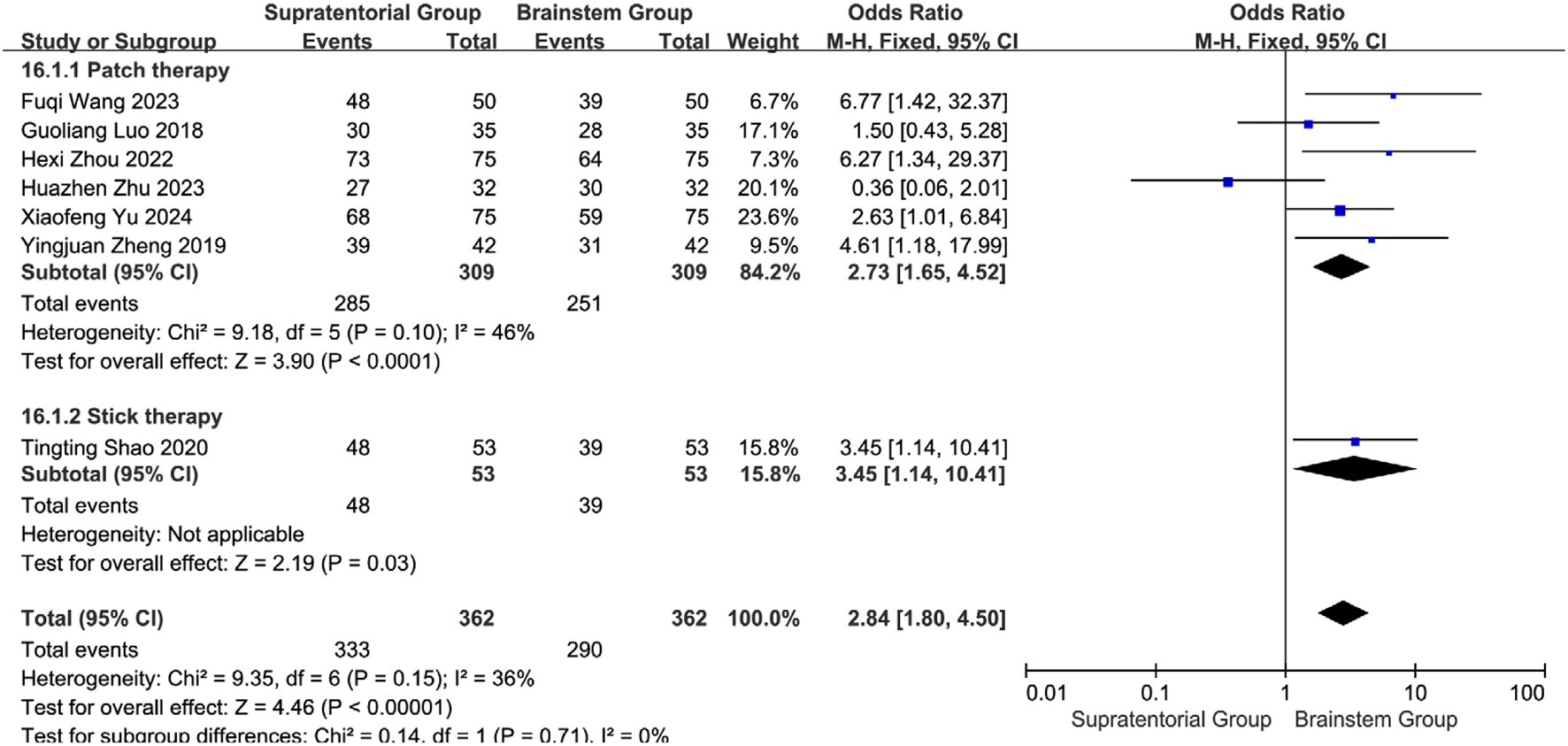 | Yu and Wu (2024) | 2024 | 75/75 | 45–78/42–80 | 28 days | ①②④⑤ | Acupoint application + rehabilitation | Rehabilitation | Tiantu point, Renying point, and Lianquan point | Supratentorial | Pinelliae Rhizoma Praeparatum,Acori Tatarinowii Rhizoma, Arisaematis Rhizoma Preparatum, Notoginseng Radix et Rhizoma, Aconiti Lateralis Radix Praeparata, Asari Radix et Rhizoma |