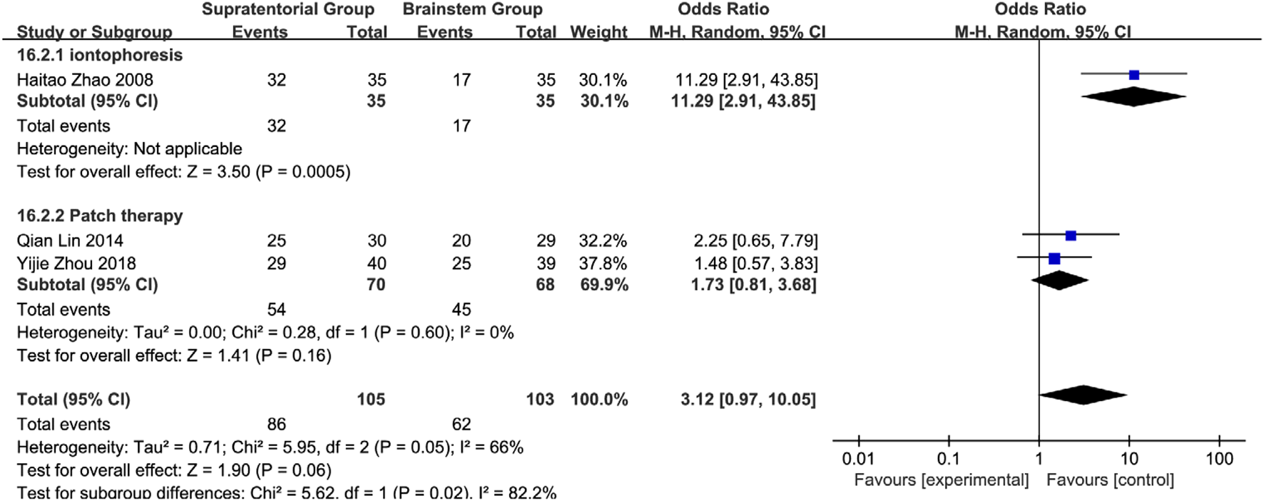 | Luo et al. (2018) | 2018 | 35/35 | 43–82/39–85 | 14 days | ①②④ | Acupoint application + rehabilitation | Rehabilitation | Lianquan point | Supratentorial | Kansui Radix, Sinapis Semen, Ephedrae Herba, Asari Radix et Rhizoma |