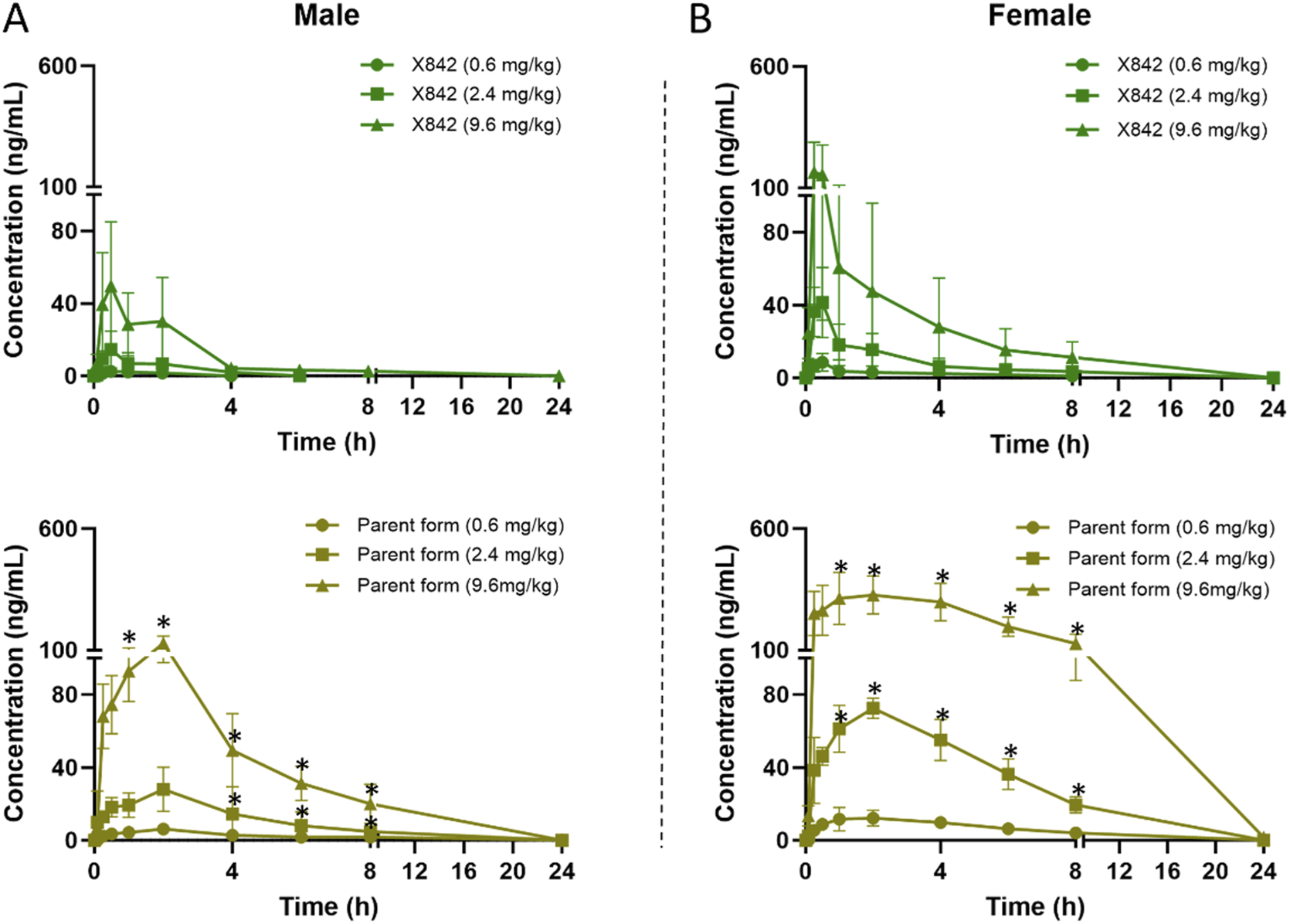 Plasma concentration of X842 after oral administration in male (A) and female (B) rats. Both the prodrug and the parent drug were evaluated (N = 6 per group). *P < 0.05, comparing the blood concentration of X842 with its metabolized parent drug at the same time points after oral administration. Supplementary Figure S2 shows a magnified view with visible error bars for the parent drug in the 0.6 mg/kg dose group.
