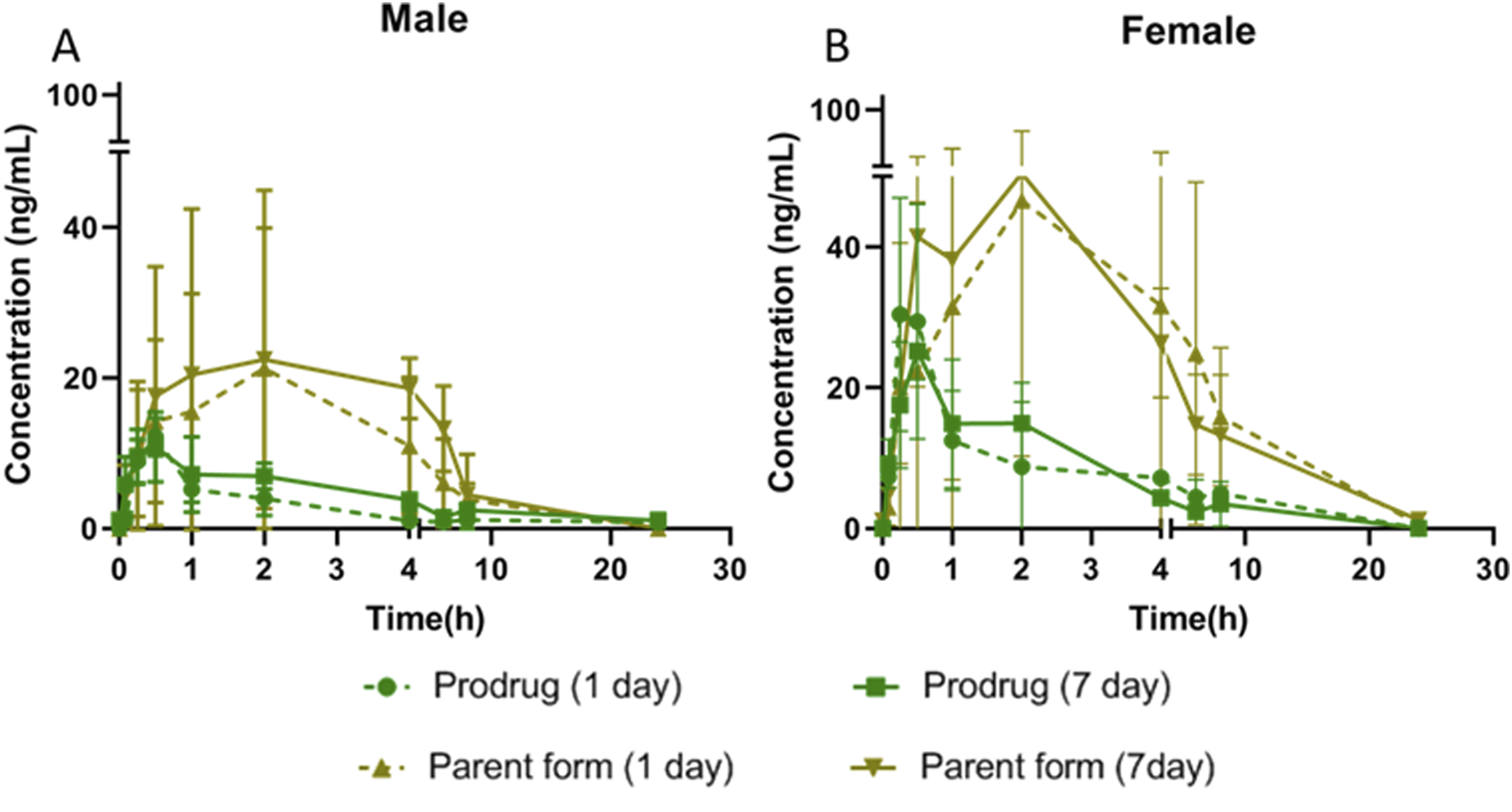 Plasma concentration of X842 after intravenous administration in male (A) and female (B) rats. Both the parent drug (linaprazan) and the prodrug (X842) were tested to evaluate their pharmacokinetic profiles (N = 6 per group).