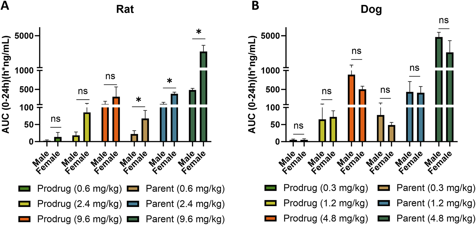 Comparison of X842 absorption [AUC(0–24h)] between male and female rats and dogs. Data from both rats (A) and dogs (B) are summarized. *P < 0.05, compared to the same parameter in males. AUC(0–24h), area under the concentration–time curve.