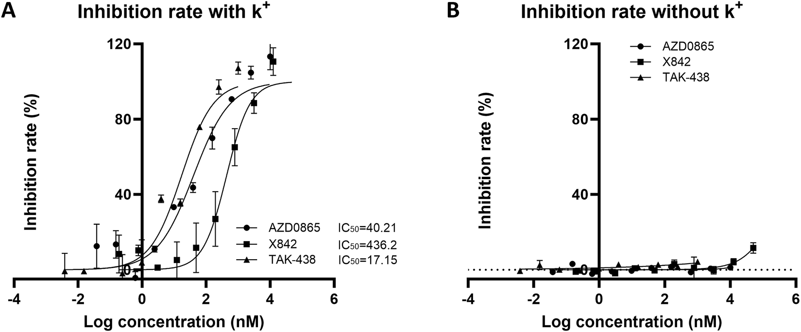 Inhibitory activity of H+/K+ ATPase from rabbit gastric glands by X842, linaprazan, and vonoprazan in the presence (A) and absence (B) of potassium ions. The data are presented as the mean ± standard error of three experiments.